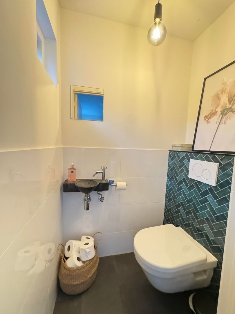 Behind the kitchen is a practical storage room with ample storage space, ideal for supplies, bicycles, or household items. A separate toilet is also located here.