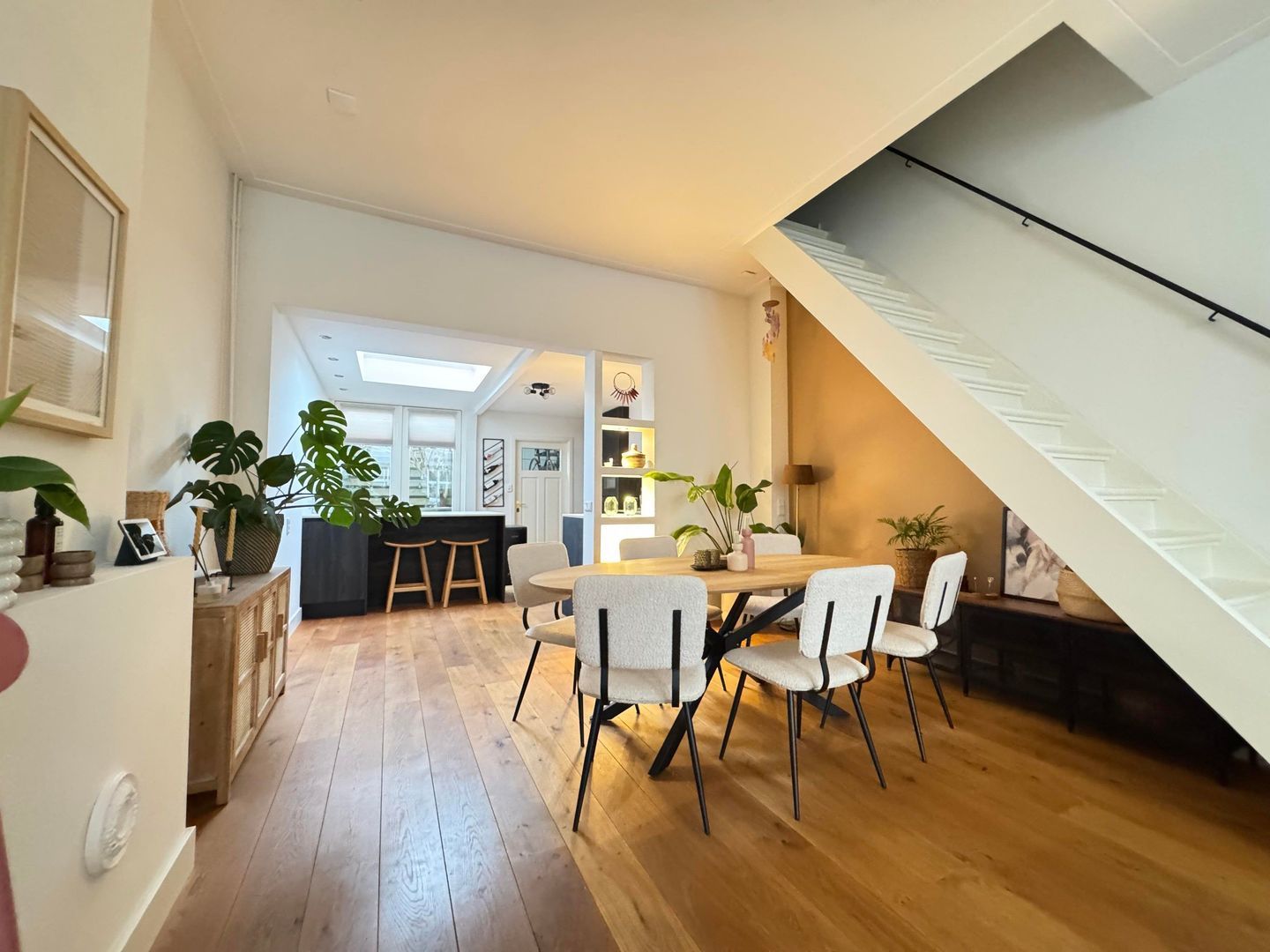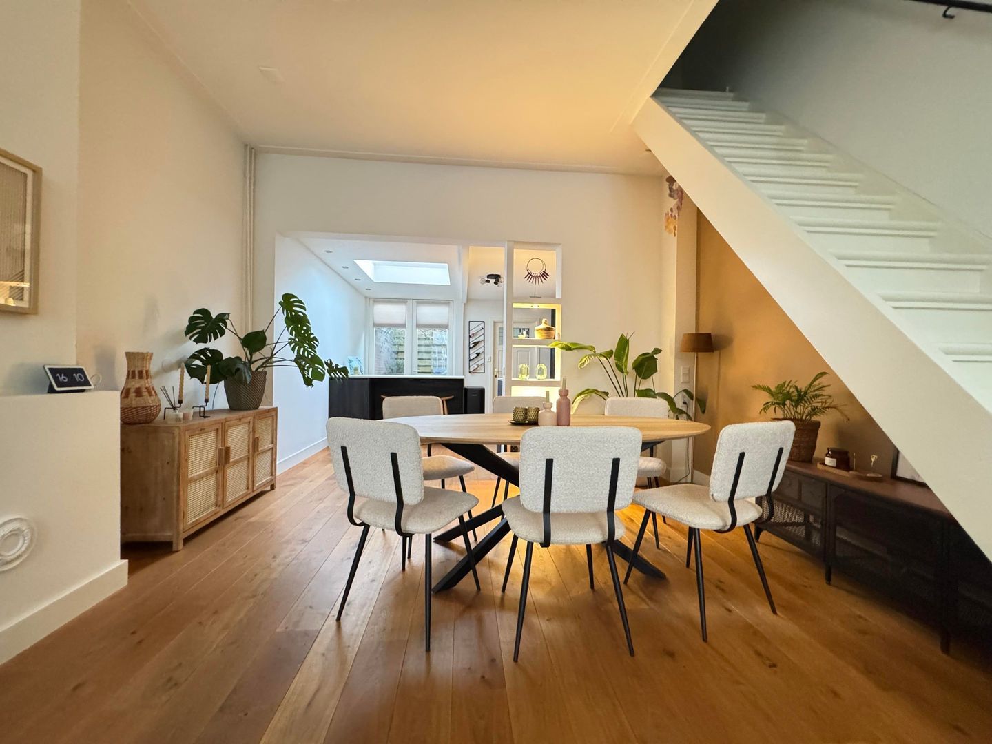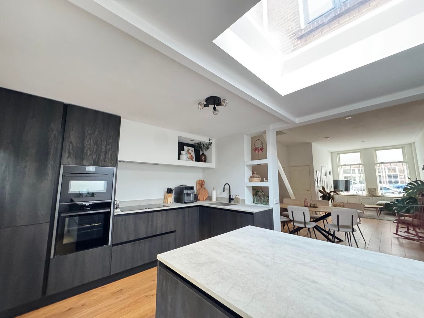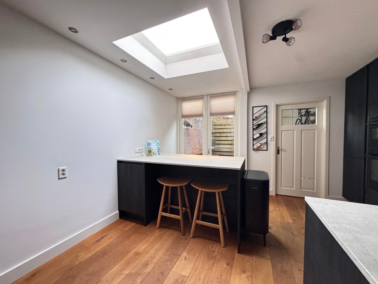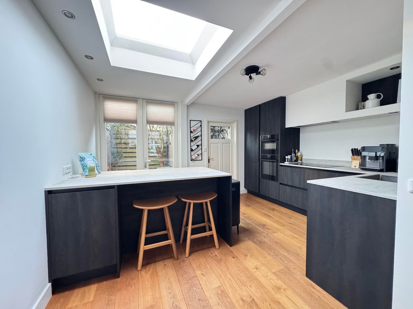 Upon entering, you'll find a spacious, bright living room with large windows at both the front and back, providing abundant natural light. The living room flows seamlessly into the semi-open, modern kitchen, equipped with various built-in appliances. A skylight in the kitchen allows you to enjoy wonderful light throughout the day. French doors from the kitchen open onto the lovely back garden, a wonderful place to relax after a busy day.