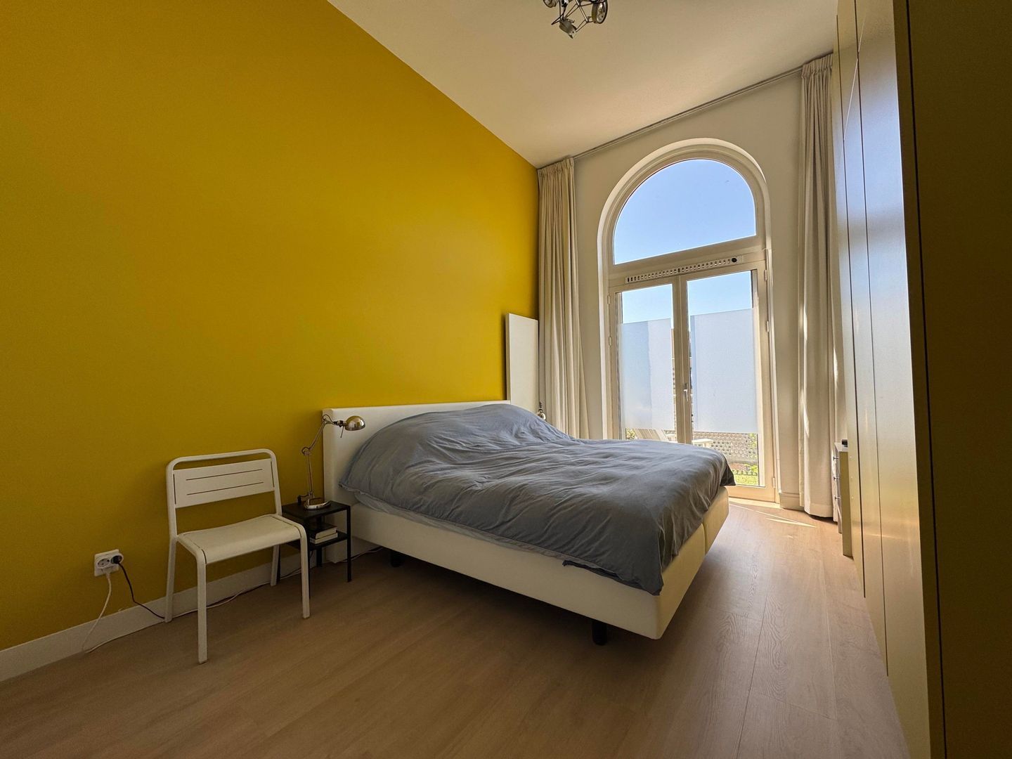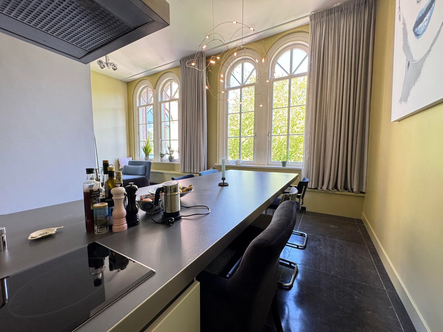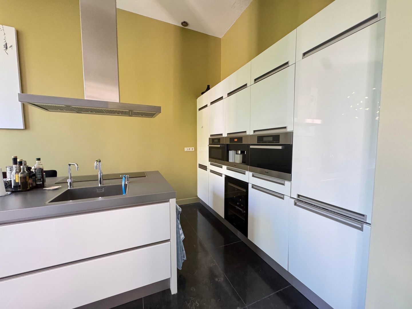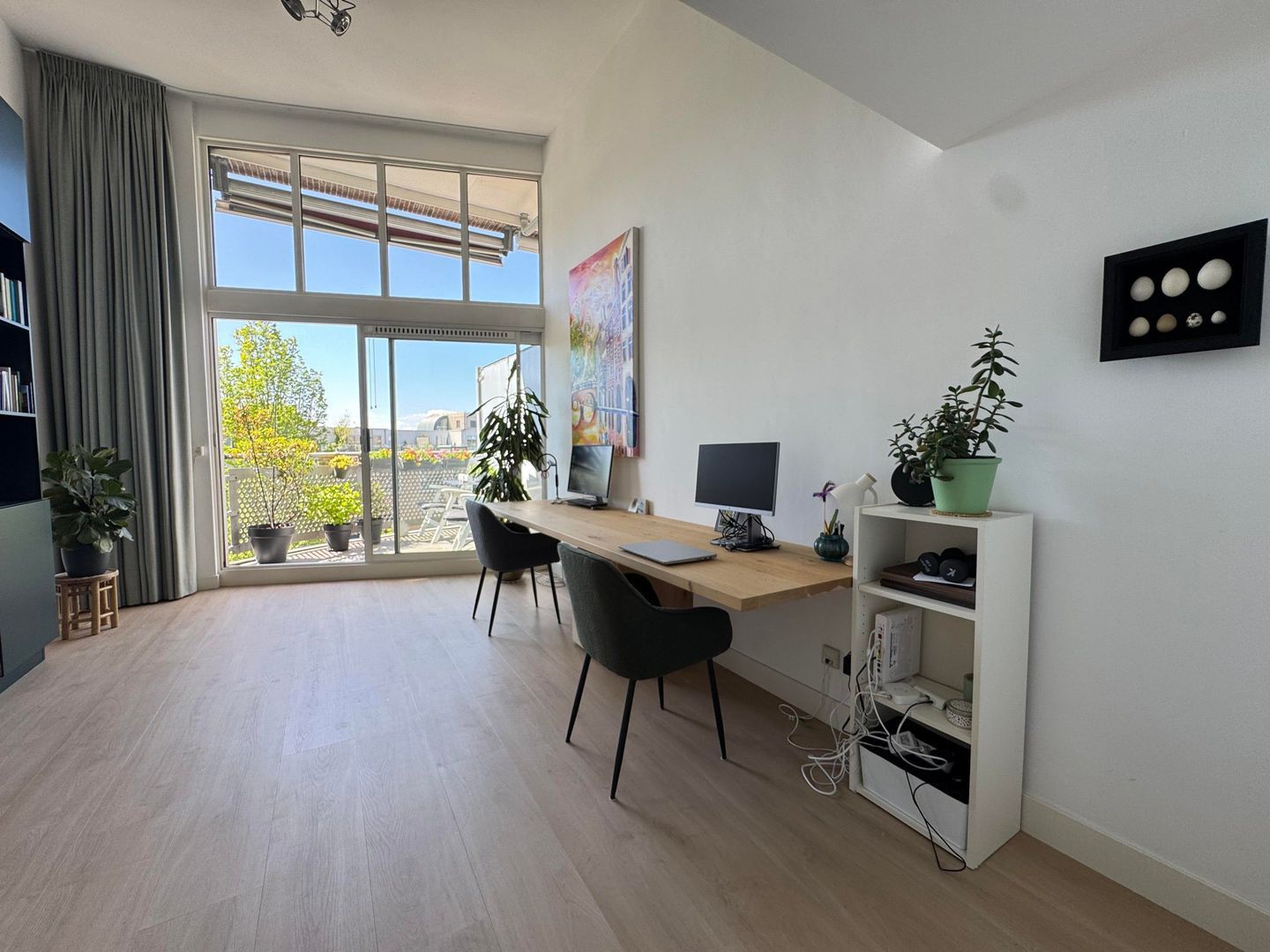 Second floor: spacious living room with luxurious half-open kitchen with an amazing view over the Catharijnesingel. The kitchen is equipped with all conceivable appliances such as built-in coffee machine, wine fridge, oven and microwave. The cooking island with continuous top is perfect for dining. Spacious study with access to west-facing terrace/balcony with afternoon and evening sun. The balcony has blinds. Bedroom with many closets and access to the second balcony. Modern and luxurious bathroom fitted with very spacious walk-in shower, double washbasin, cupboard and washing machine and dryer. Separate toilet.