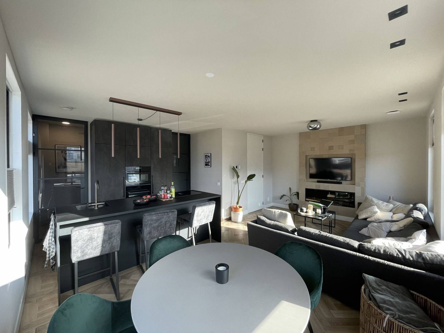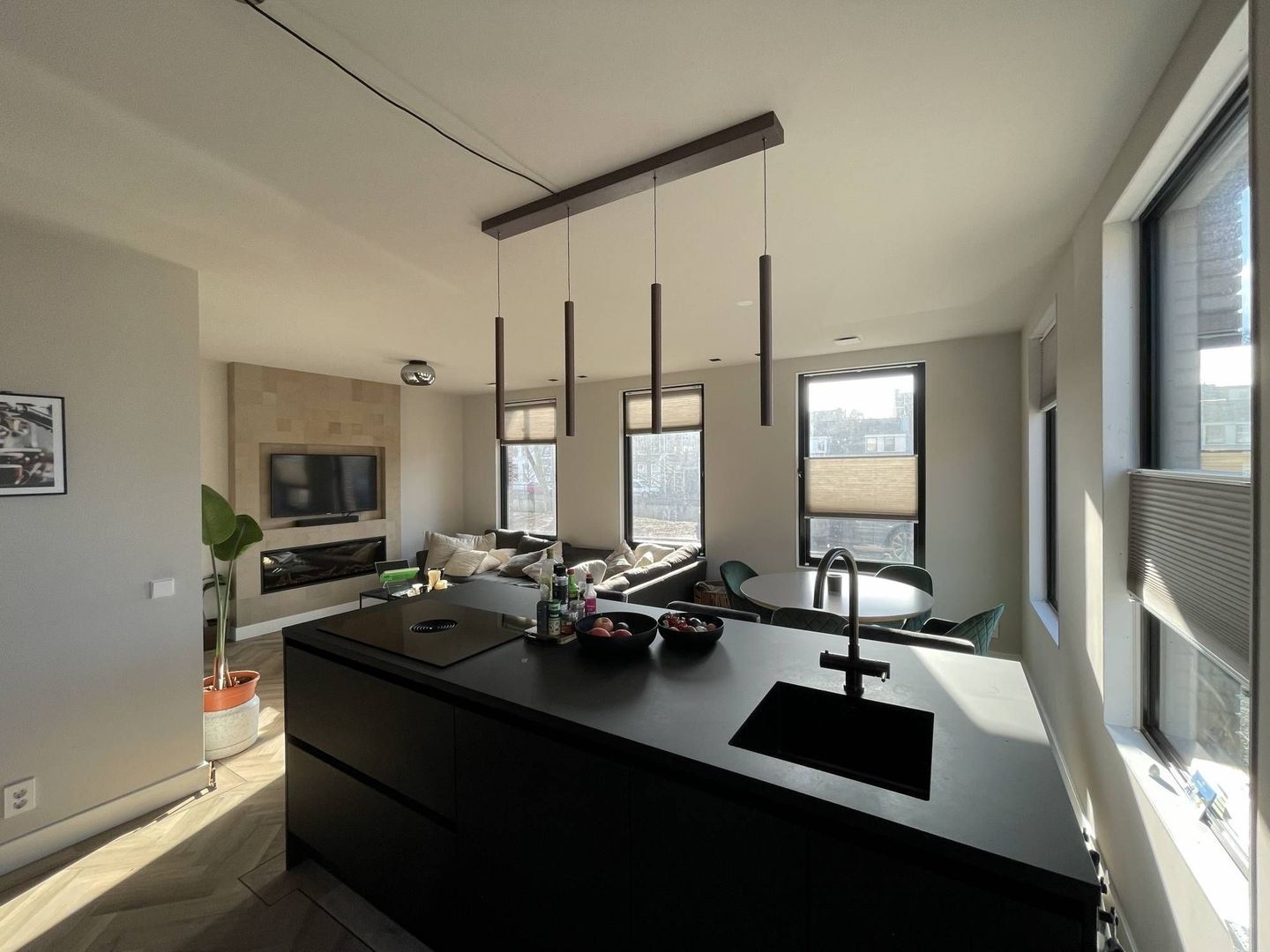 Layout: entrance, hall with toilet and storage cupboard. Access to bright living room with gas fireplace. Open modern luxury black kitchen with appliances and bar.