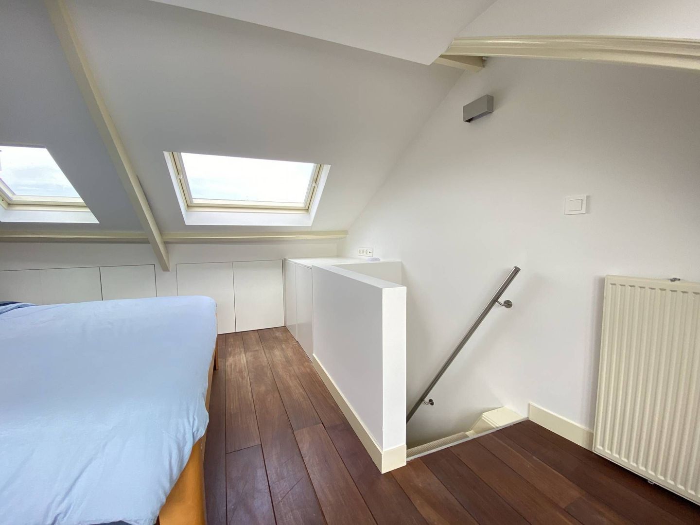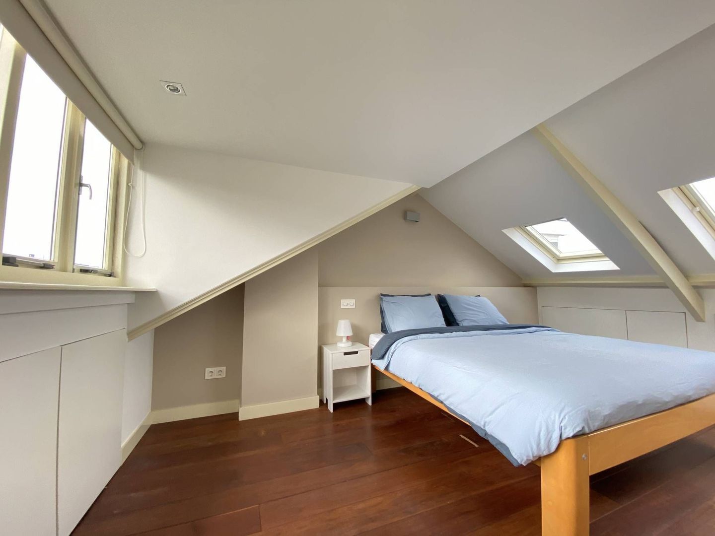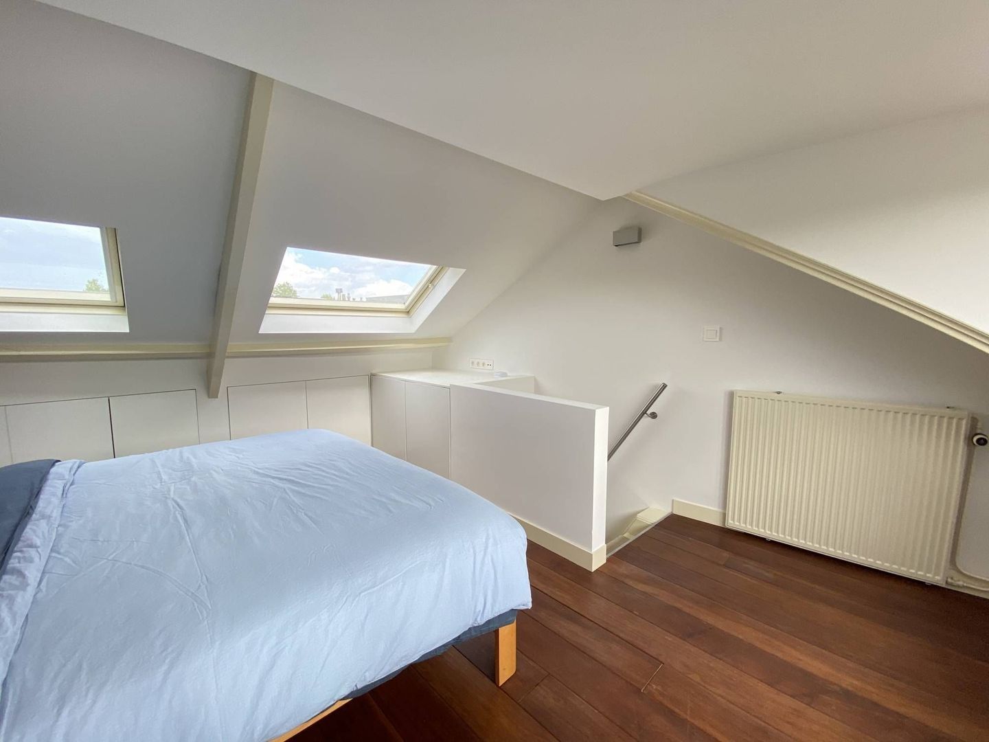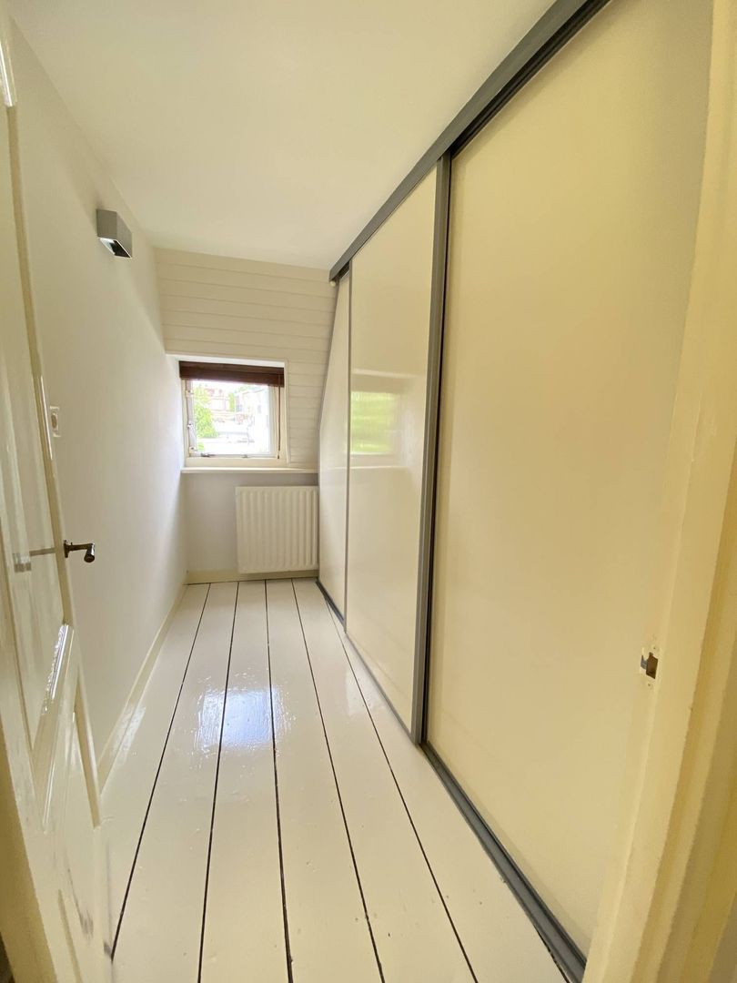 2nd floor: light and spacious 3rd bedroom with beautiful hardwood floor. This room has a dormer over the entire width of the house. It has ample storage space behind neatly concealed partitions. The dryer and washing machine are placed on the 2nd floor. These are also neatly concealed. The lighting is integrated in the room.