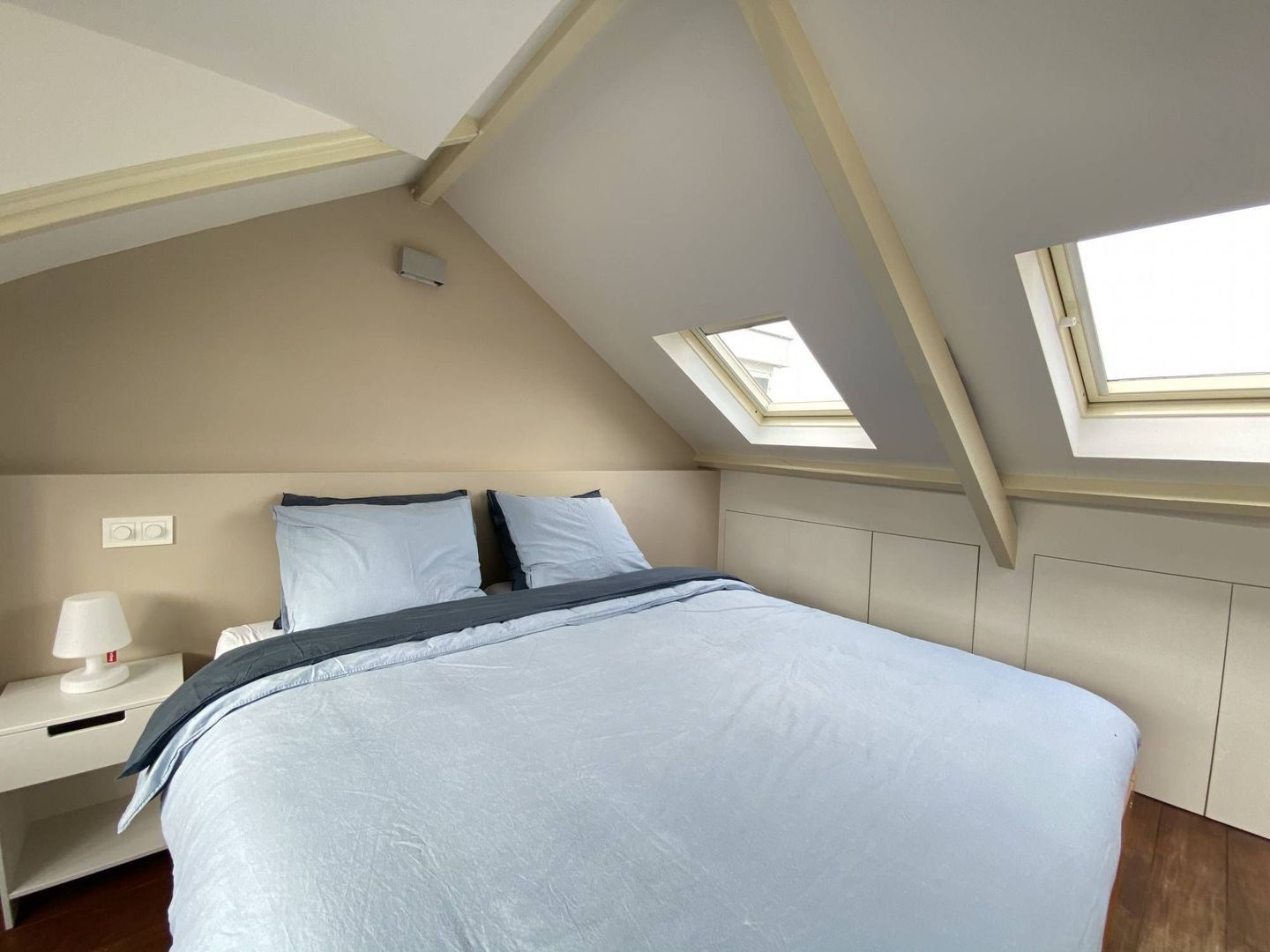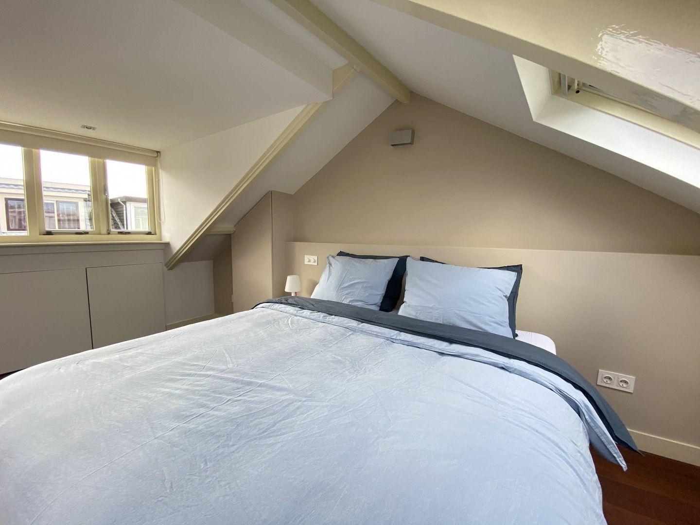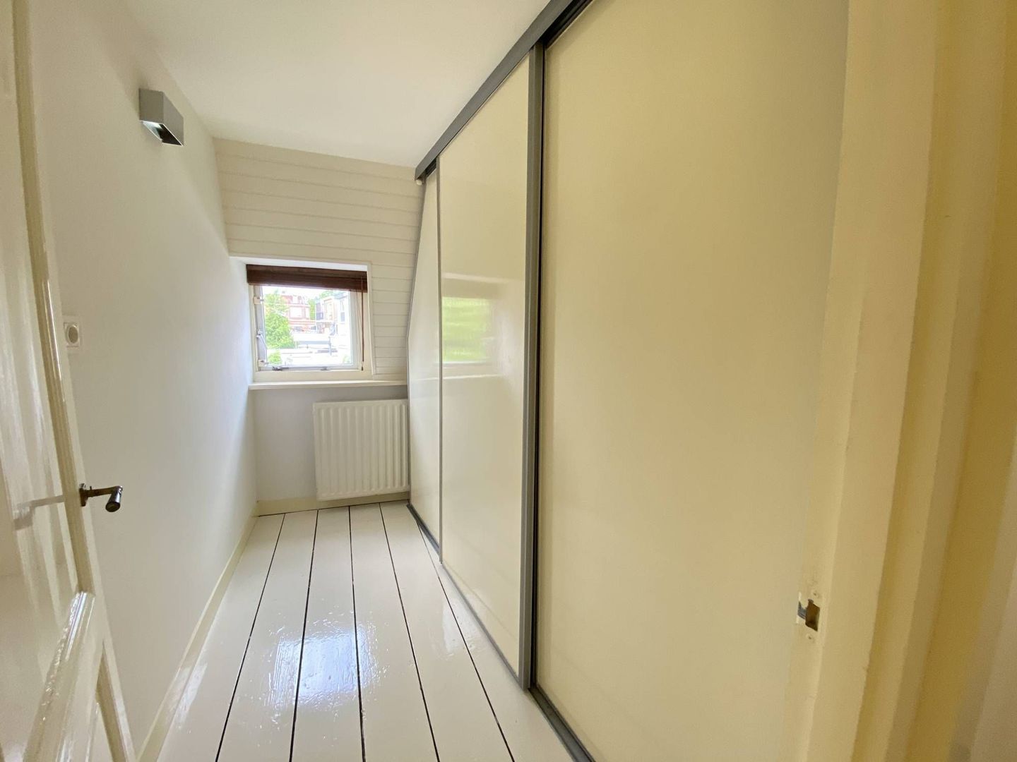 2nd floor: light and spacious 3rd bedroom with beautiful hardwood floor. This room has a dormer over the entire width of the house. It has ample storage space behind neatly concealed partitions. The dryer and washing machine are placed on the 2nd floor. These are also neatly concealed. The lighting is integrated in the room.