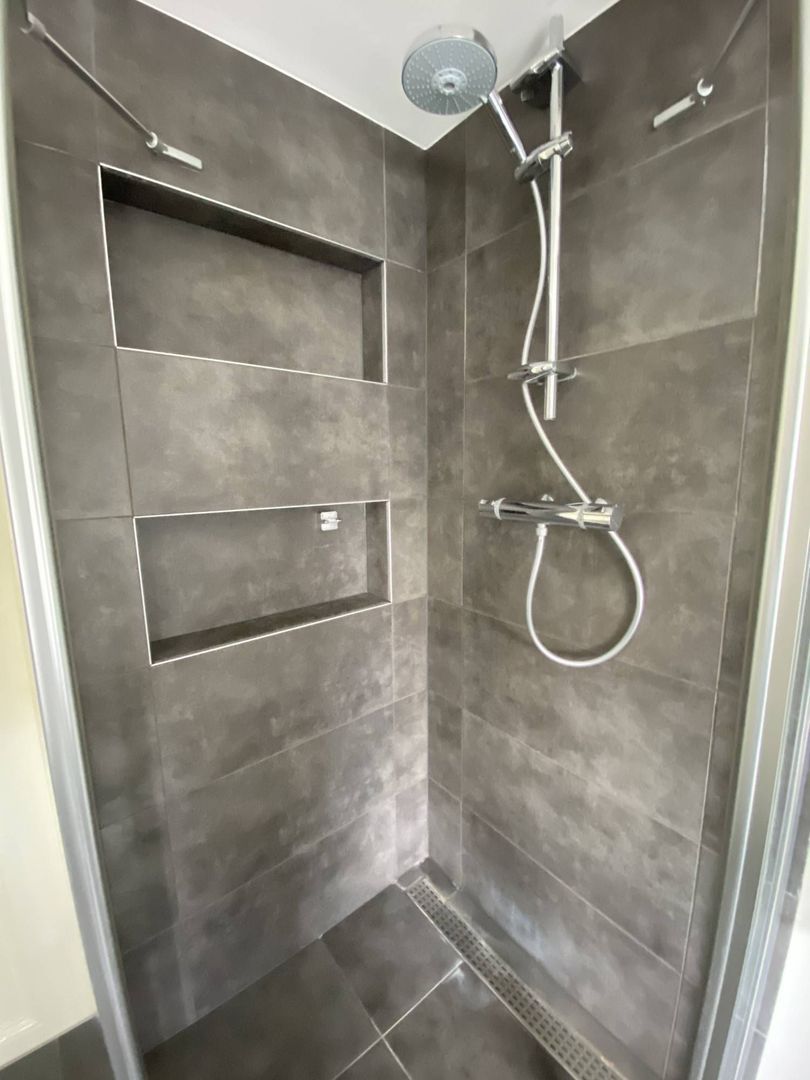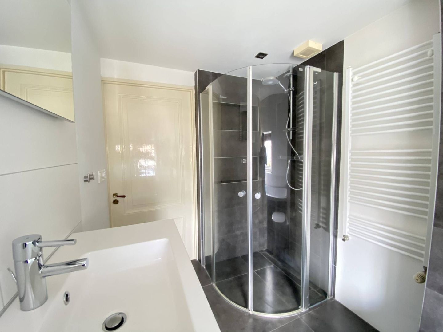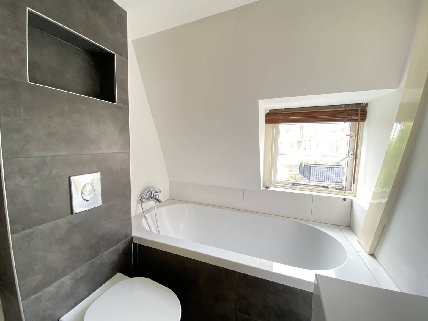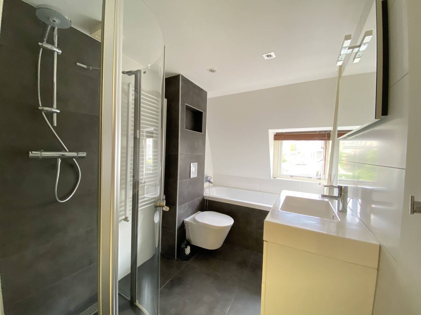 2nd floor: light and spacious 3rd bedroom with beautiful hardwood floor. This room has a dormer over the entire width of the house. It has ample storage space behind neatly concealed partitions. The dryer and washing machine are placed on the 2nd floor. These are also neatly concealed. The lighting is integrated in the room.