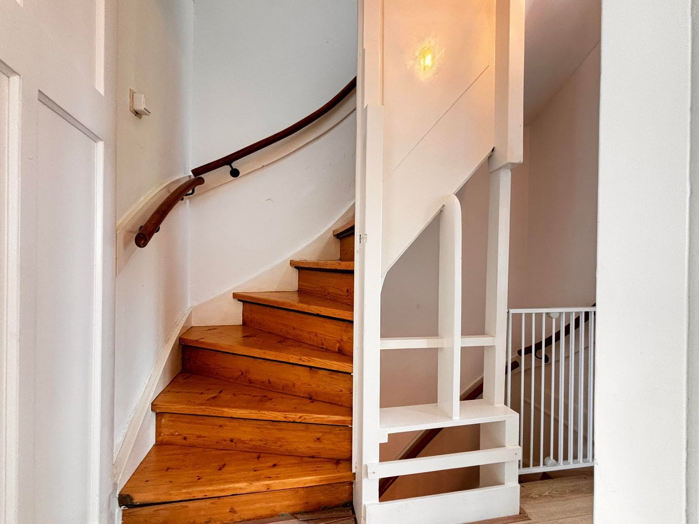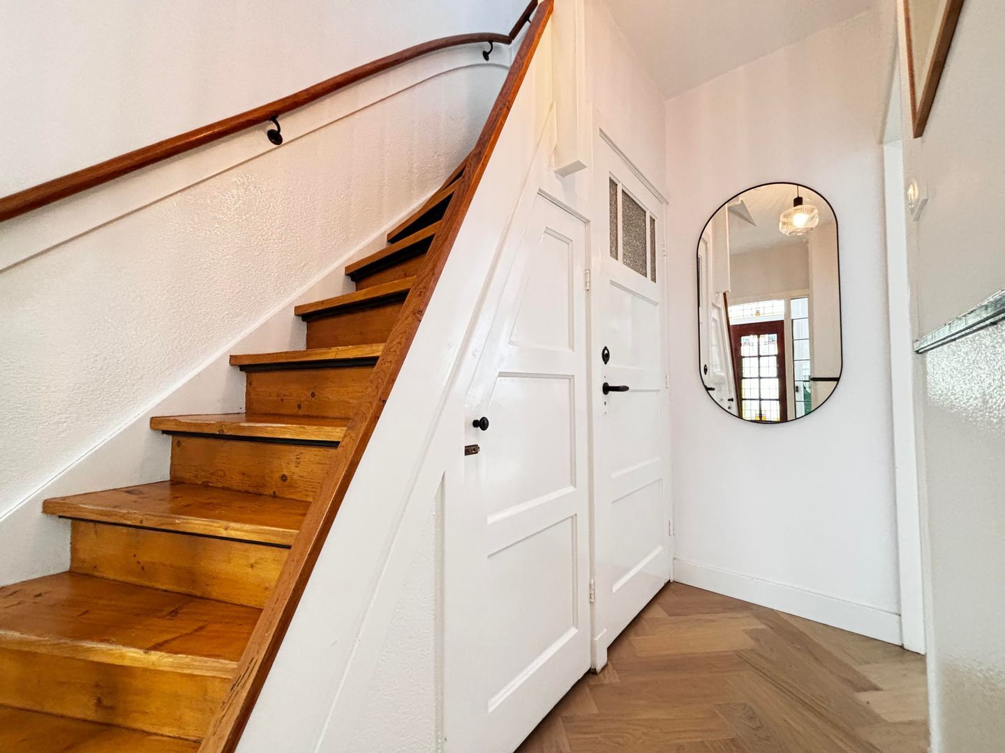 The cozy sitting room with bay window has typical 1930s details, such as en-suite doors with stain glass that provide access to the very spacious dining room/open kitchen. The modern kitchen is equipped with all necessary built-in appliances and the cooking island is also an ideal breakfast or drinks spot. The well-kept backyard - located on the West - is accessible through the double doors. There is a practical storage room in the garden. This is easily accessible by bicycle via the back entrance.