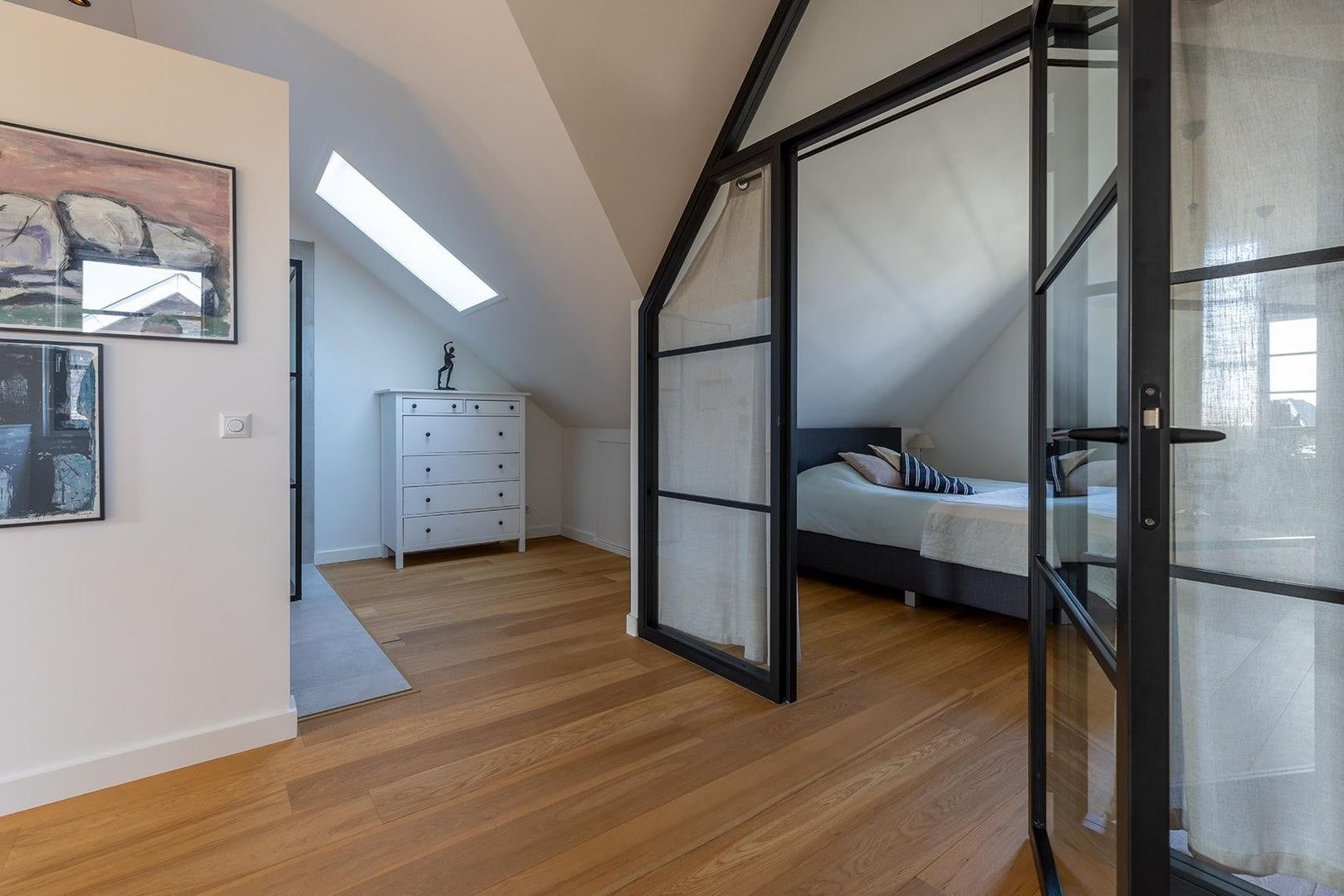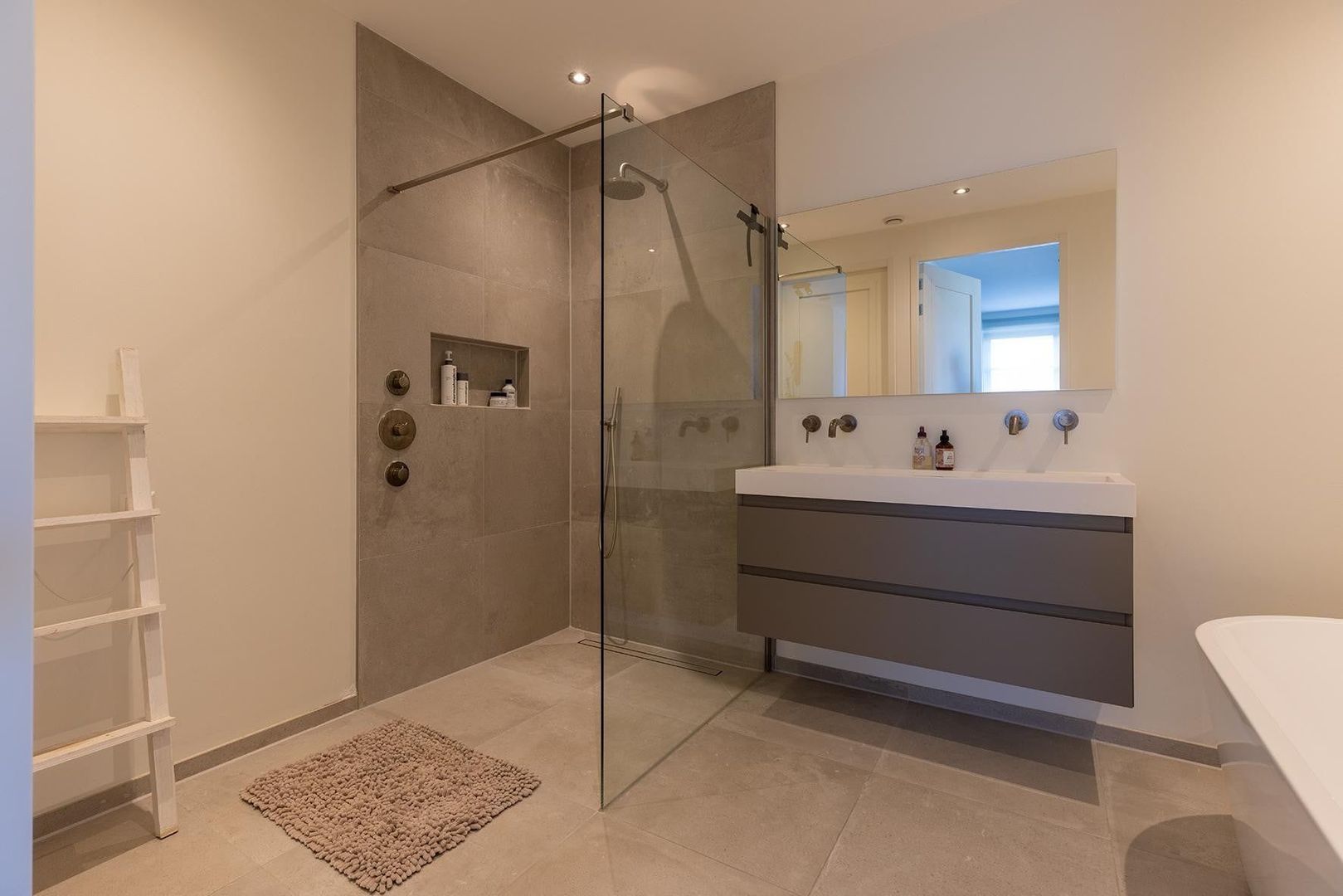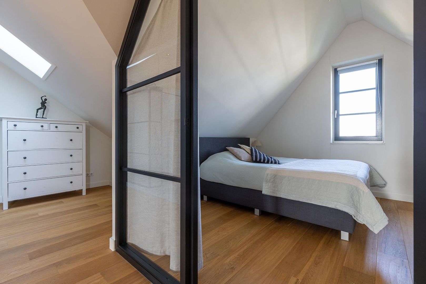 Ruime hal, master bedroom met walk-in-closet, nog twee ruime slaapkamers, luxe badkamer met ruime douche, vrijstaand bad en dubbele wastafel. Separaat toilet.