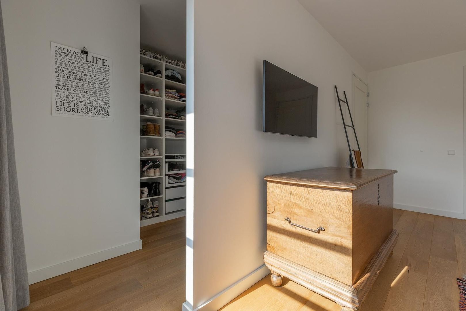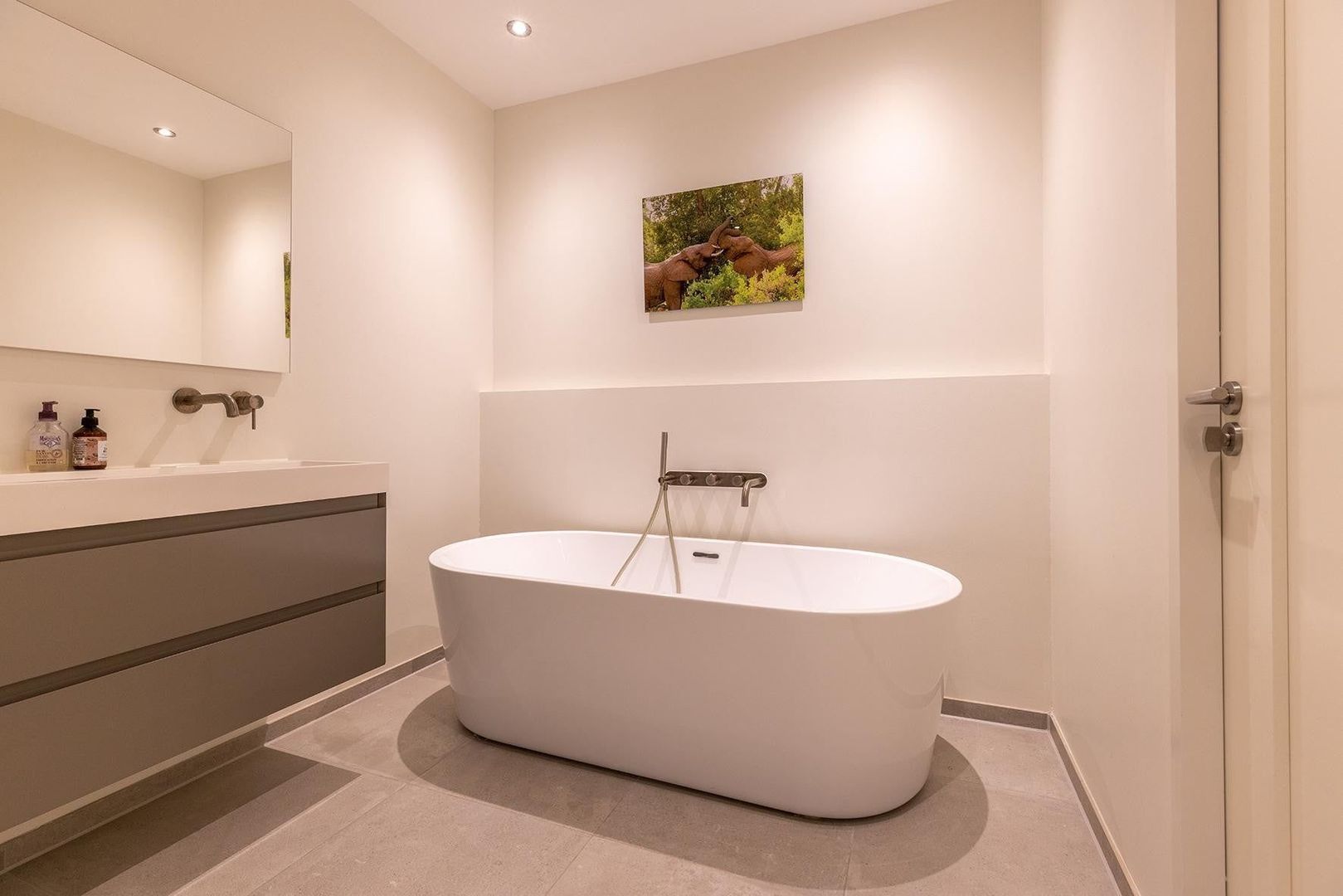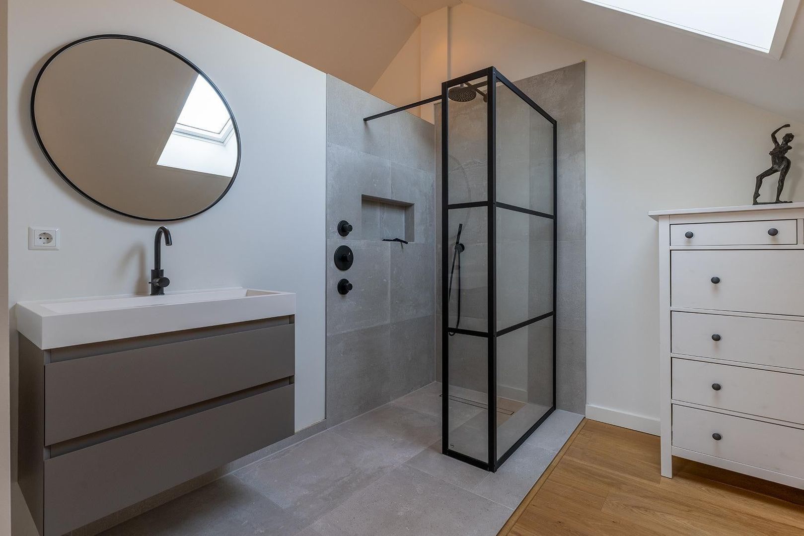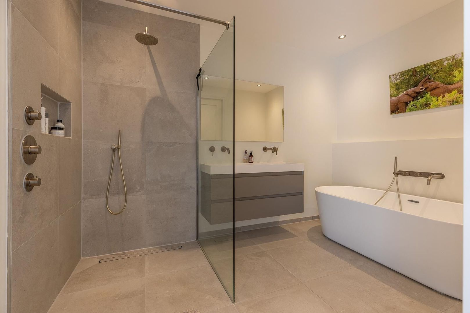 Ruime hal, master bedroom met walk-in-closet, nog twee ruime slaapkamers, luxe badkamer met ruime douche, vrijstaand bad en dubbele wastafel. Separaat toilet.