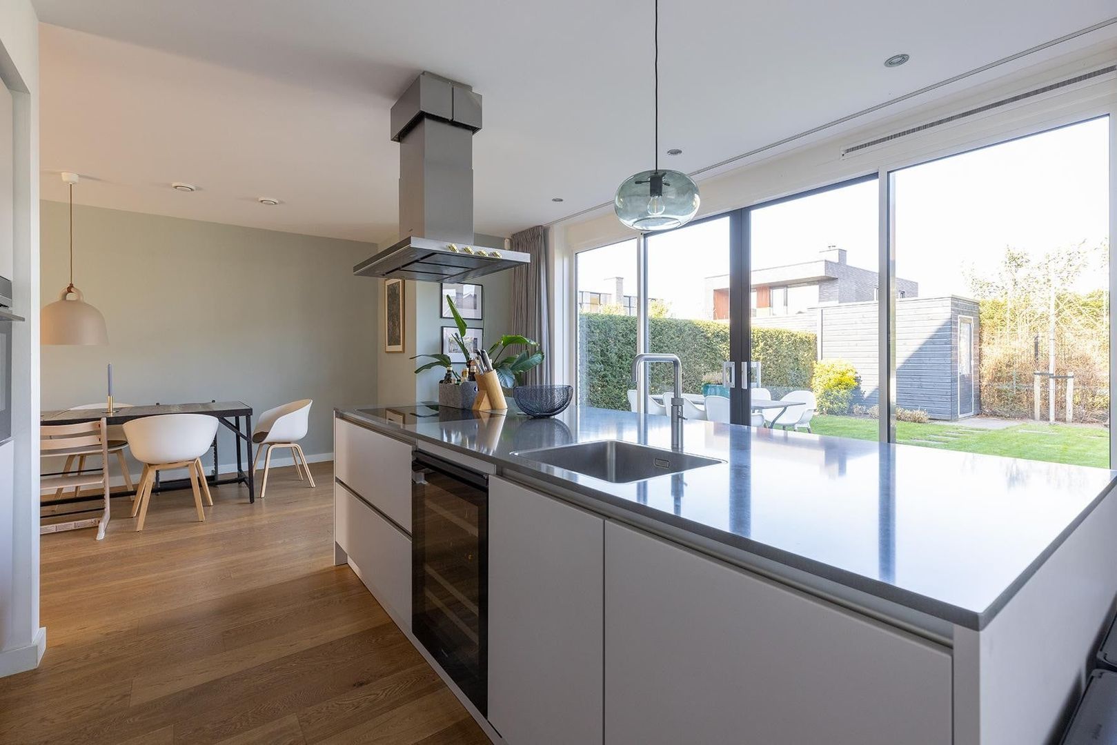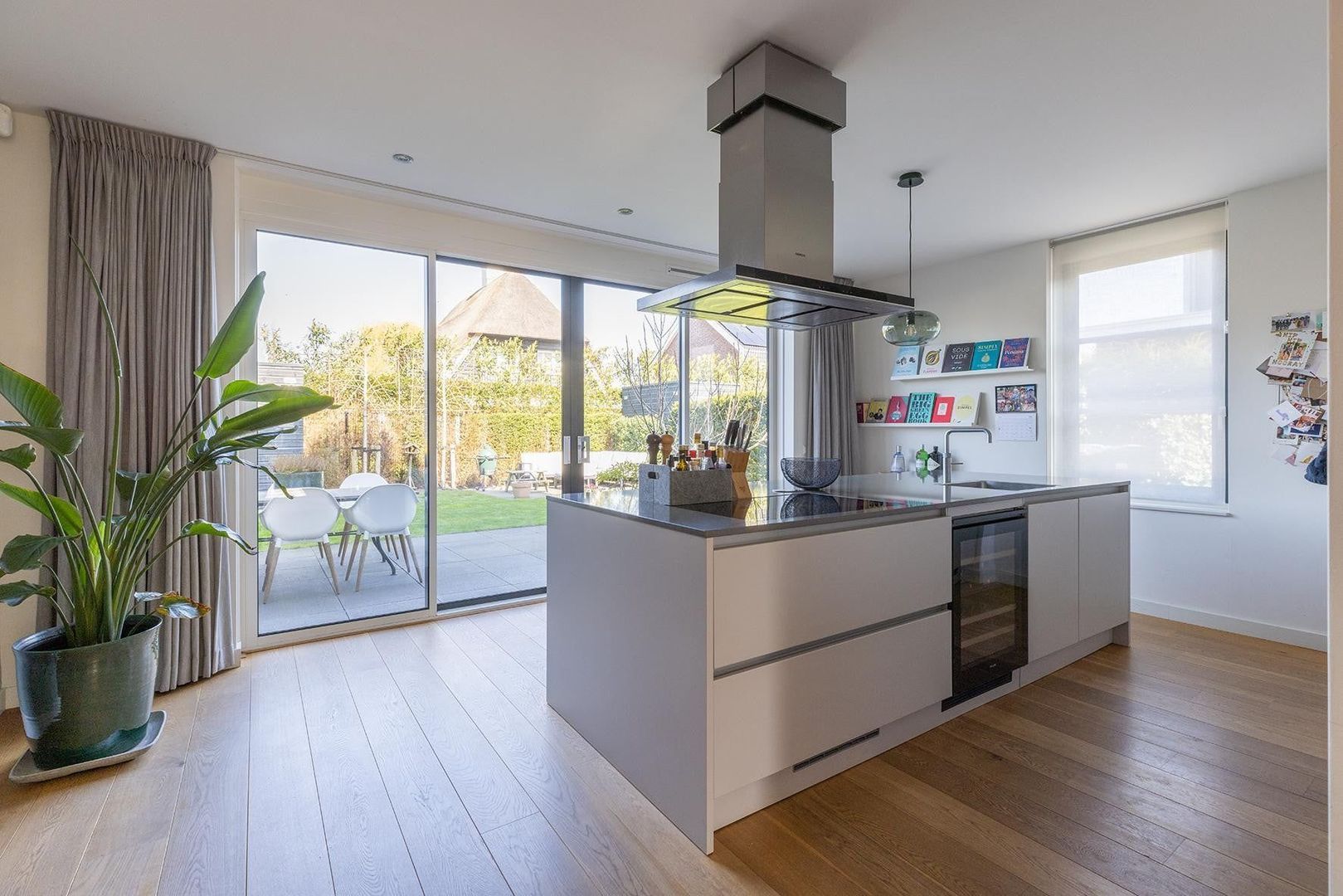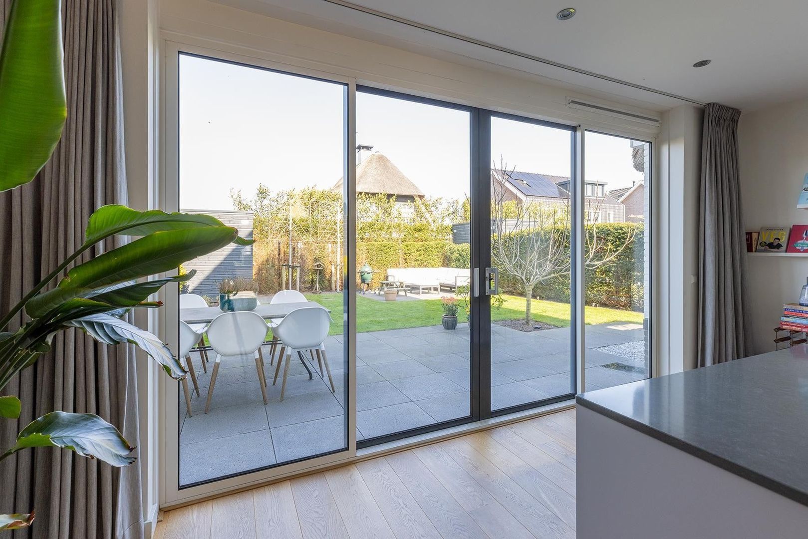 Entree, hal, ruim toilet met fontein, lichte en ruime woonkamer met houten vloer, eetkamer en half open luxe keuken met alle apparatuur, kookeiland en bar. Schuifpui naar mooi onderhouden en beschutte tuin met separate berging. Aan de zijkant van de woning een ruime oprit met parkeergelegenheid.