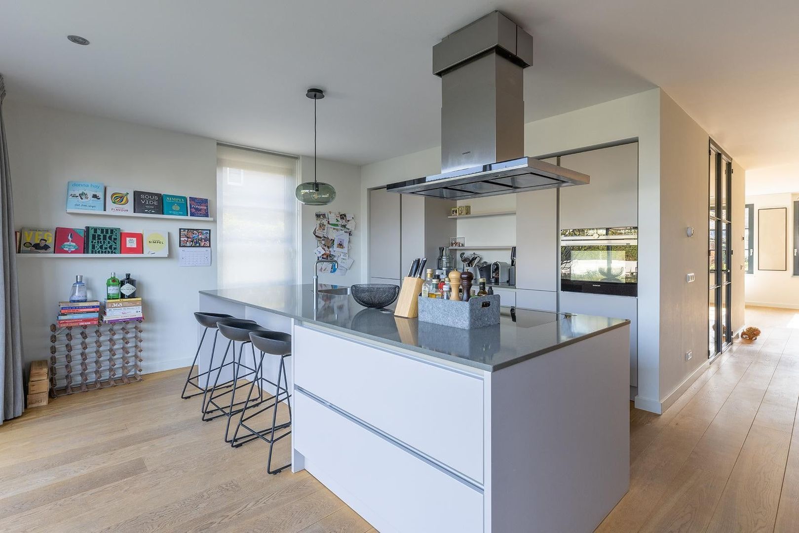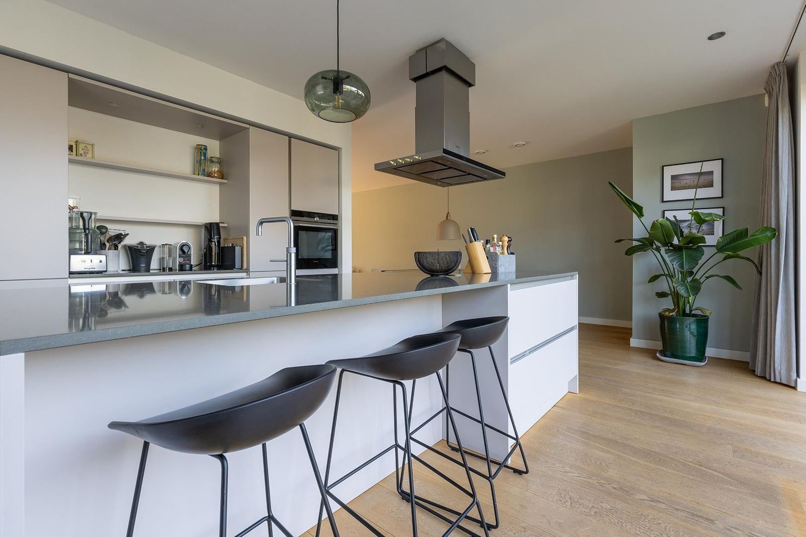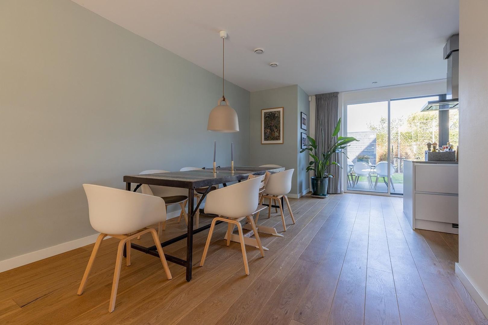Entree, hal, ruim toilet met fontein, lichte en ruime woonkamer met houten vloer, eetkamer en half open luxe keuken met alle apparatuur, kookeiland en bar. Schuifpui naar mooi onderhouden en beschutte tuin met separate berging. Aan de zijkant van de woning een ruime oprit met parkeergelegenheid.