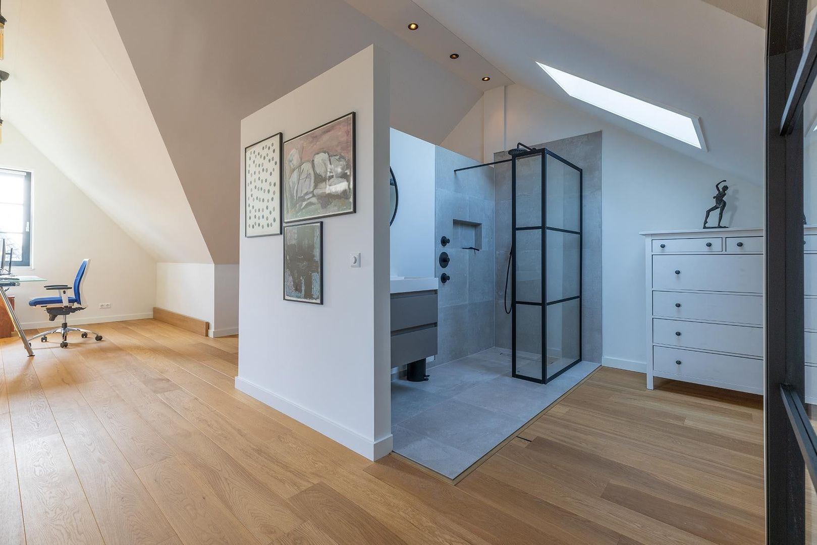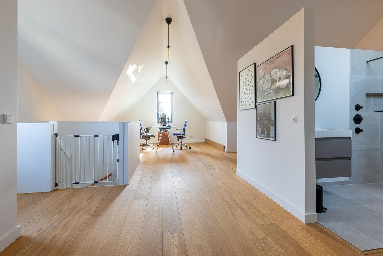 Ruime open werkkamer / hobbyruimte, laundry, badkamer met ruime douche en wastafel, separaat toilet en vierde slaapkamer.