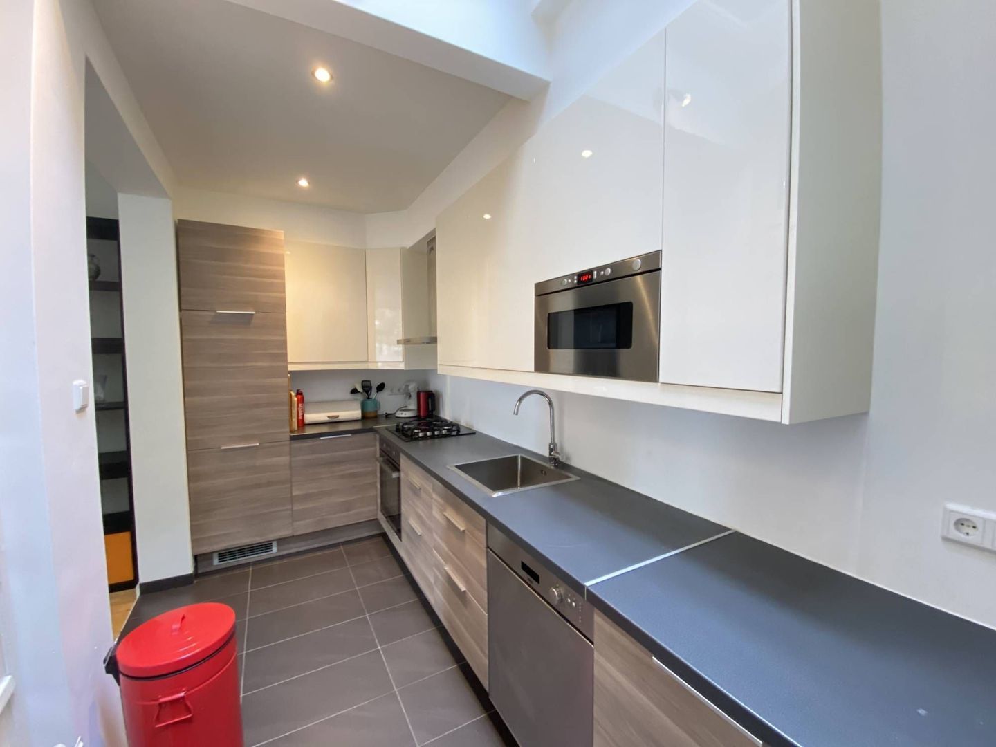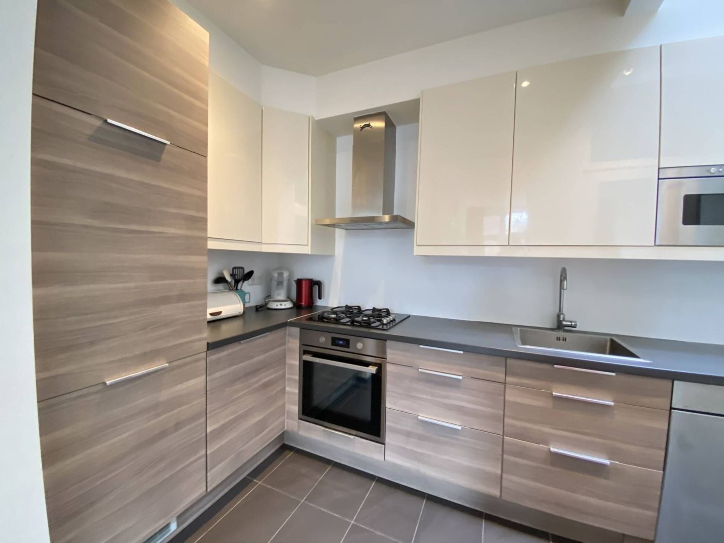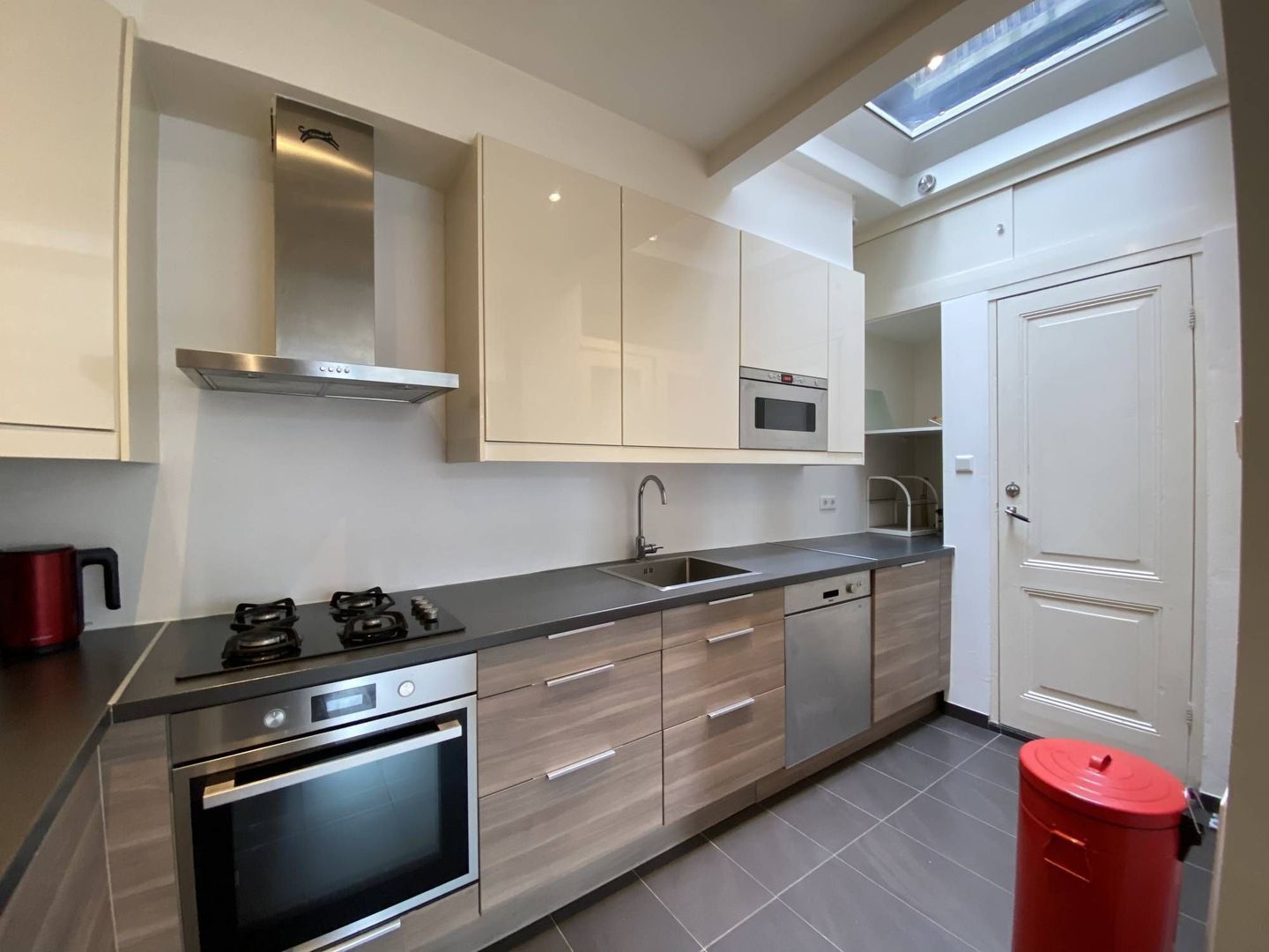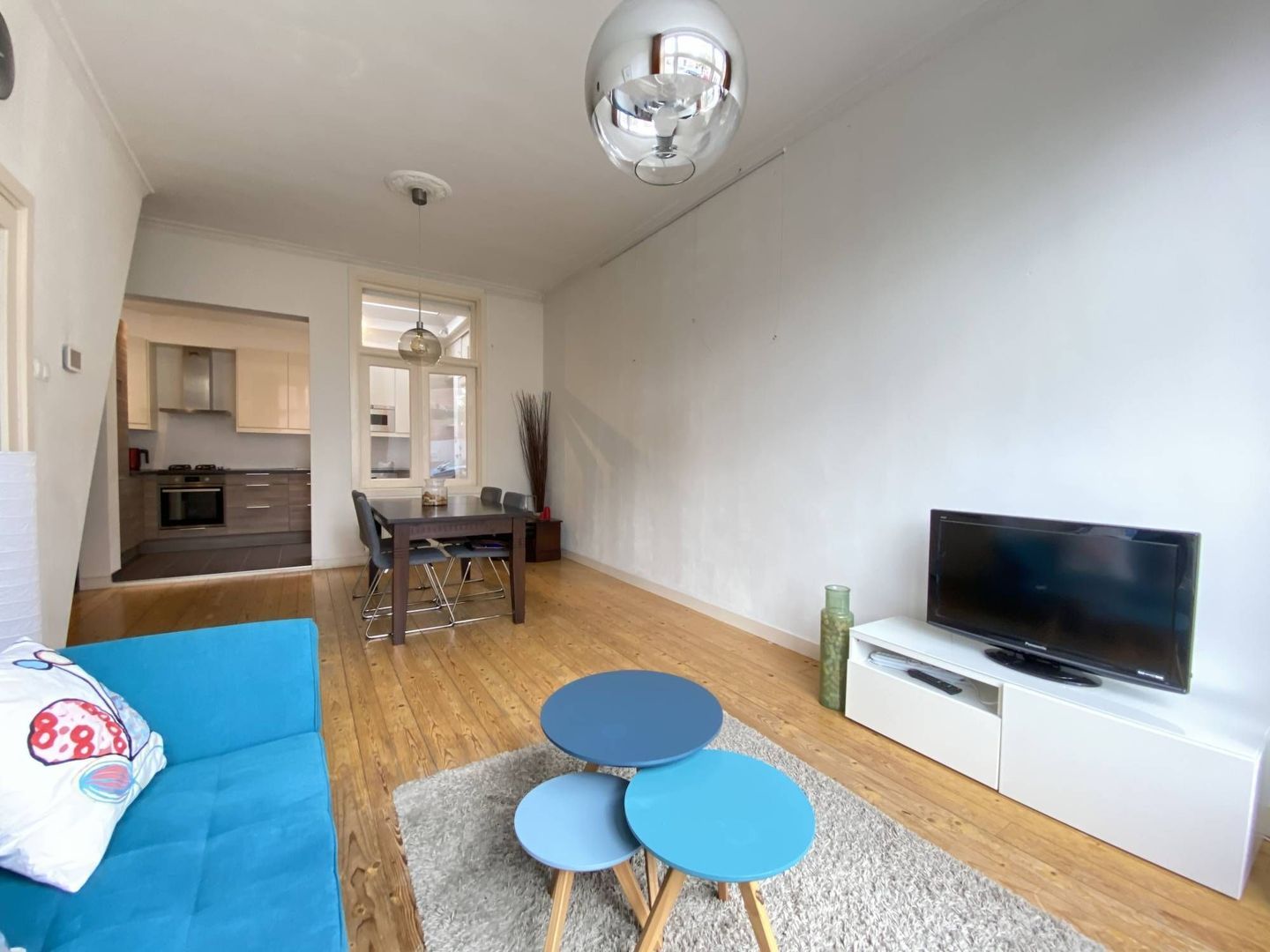 Deze woning heeft op de begane grond een lichte woon/eetkamer met hardhouten vloer, een half open keuken met diverse moderne inbouwapparatuur en een toilet.