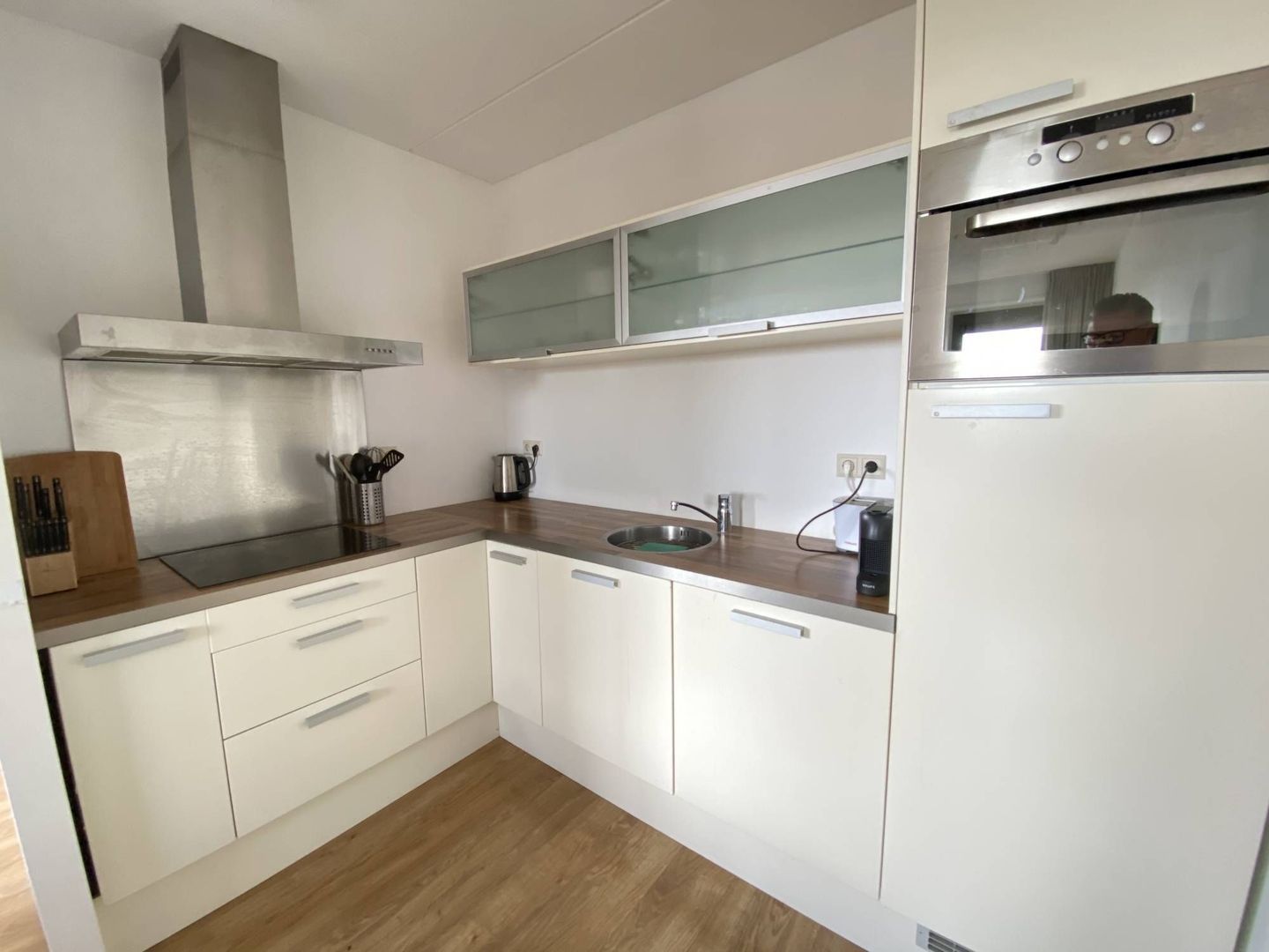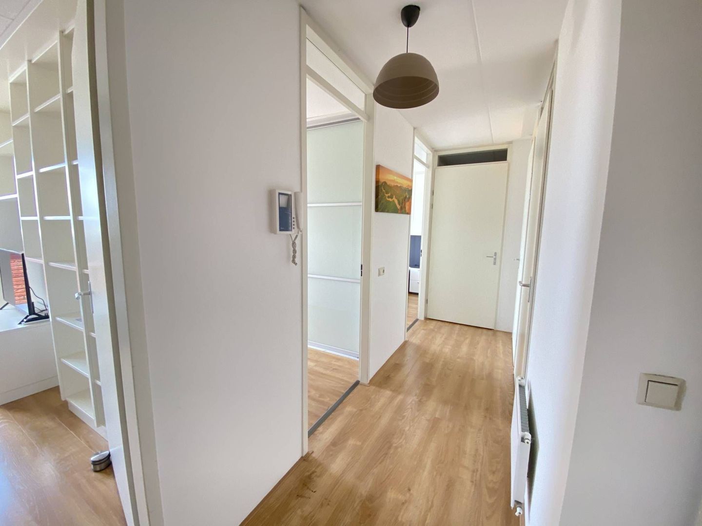 Entree, ruime hal, lichte woonkamer. Open keuken met diverse apparatuur en via openslaande deuren is het dakterras (oost) bereikbaar.