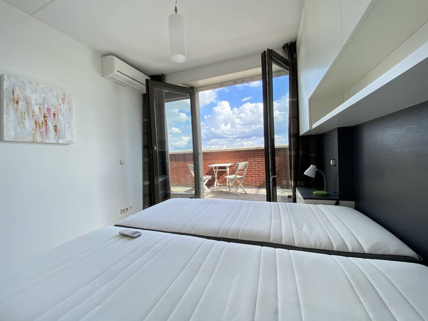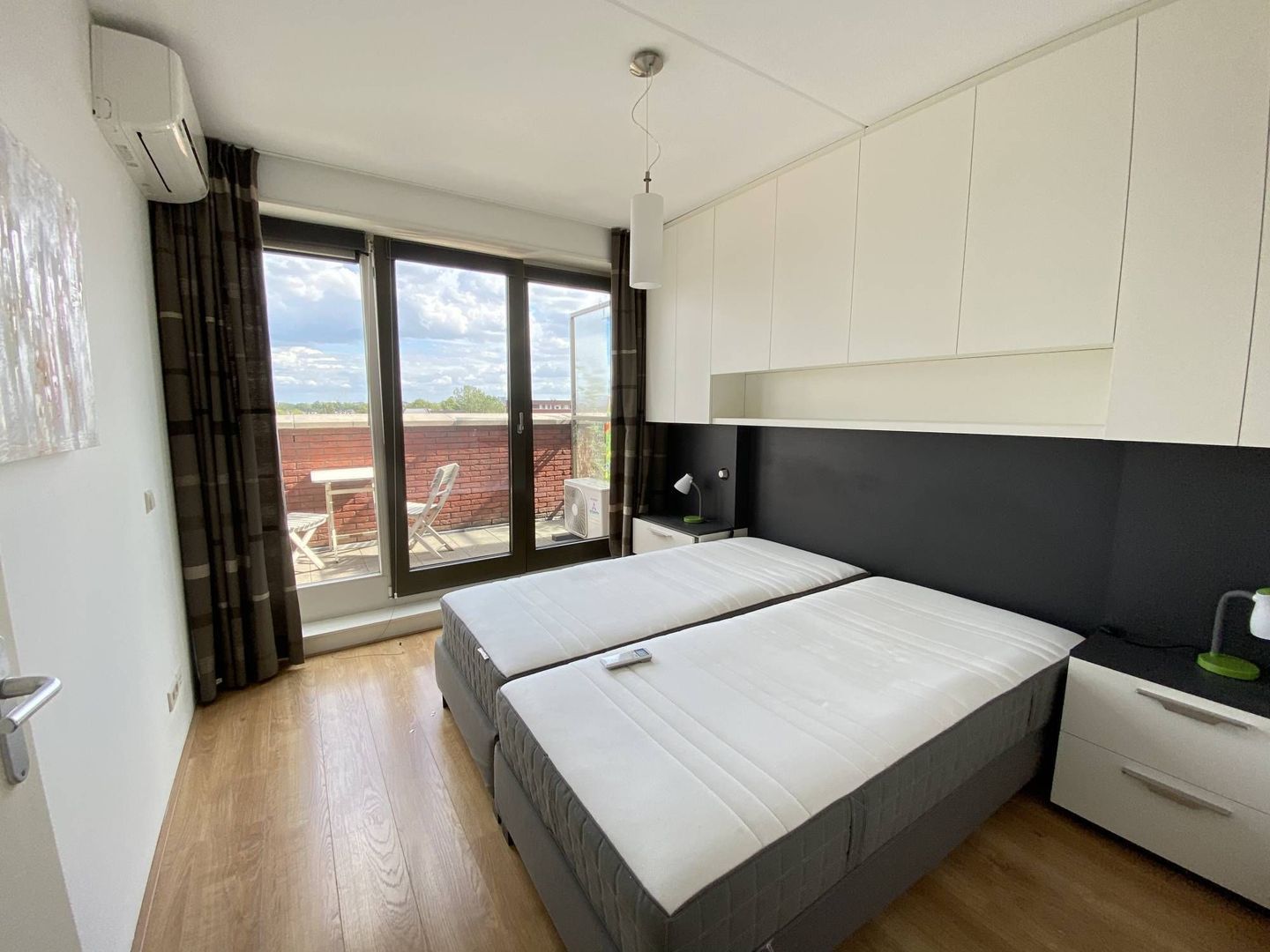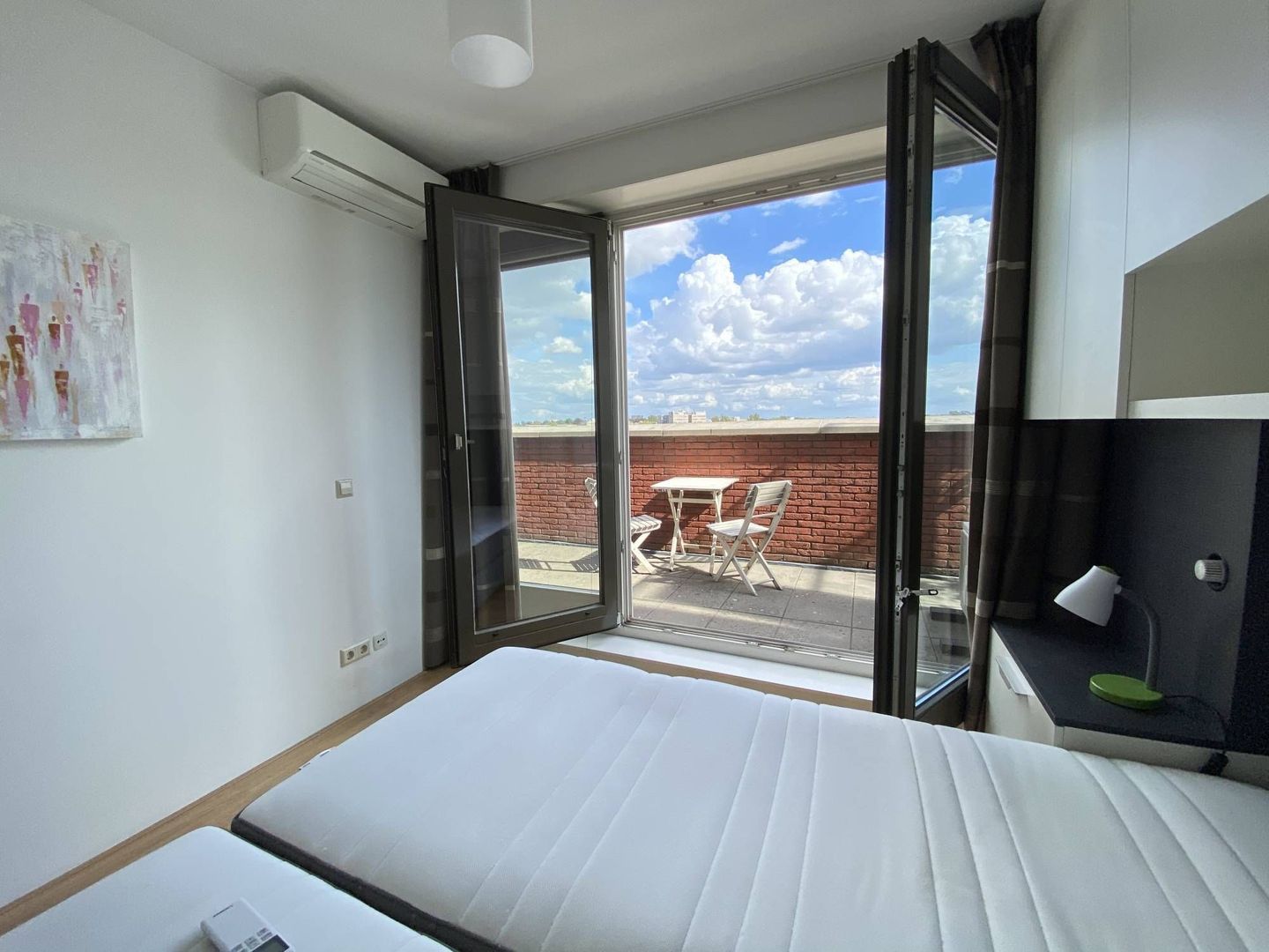 1e slaapkamer met met airconditioning en toegang tot het terras, vanuit de tweede slaapkamer is ook toegang tot het terras.