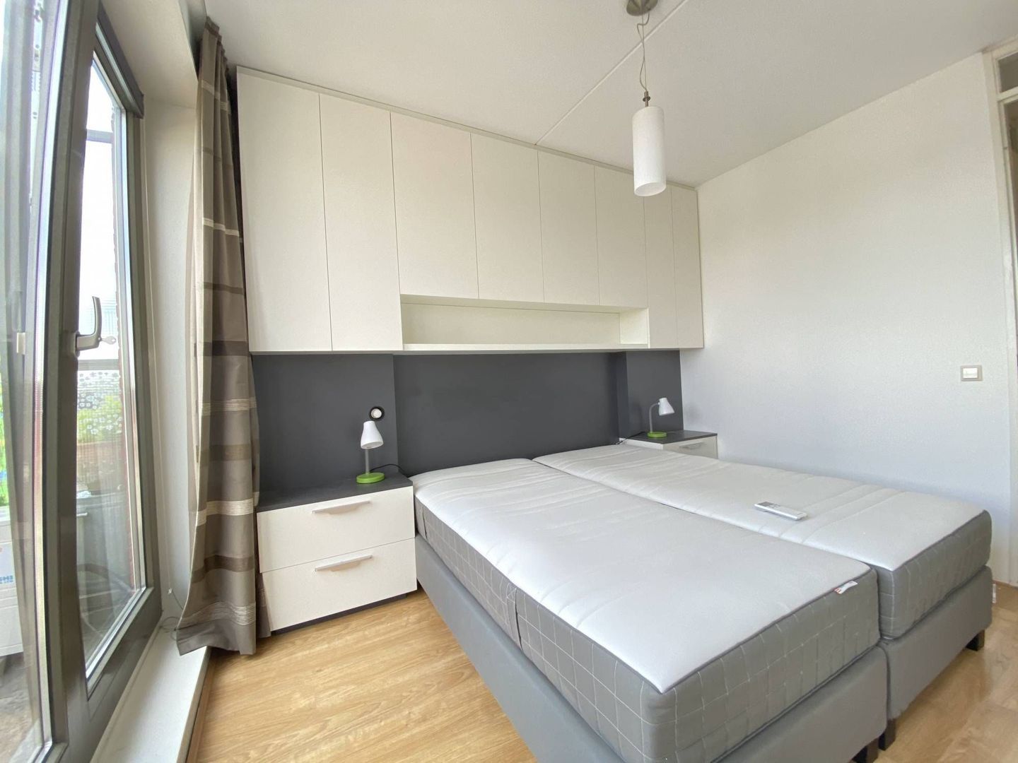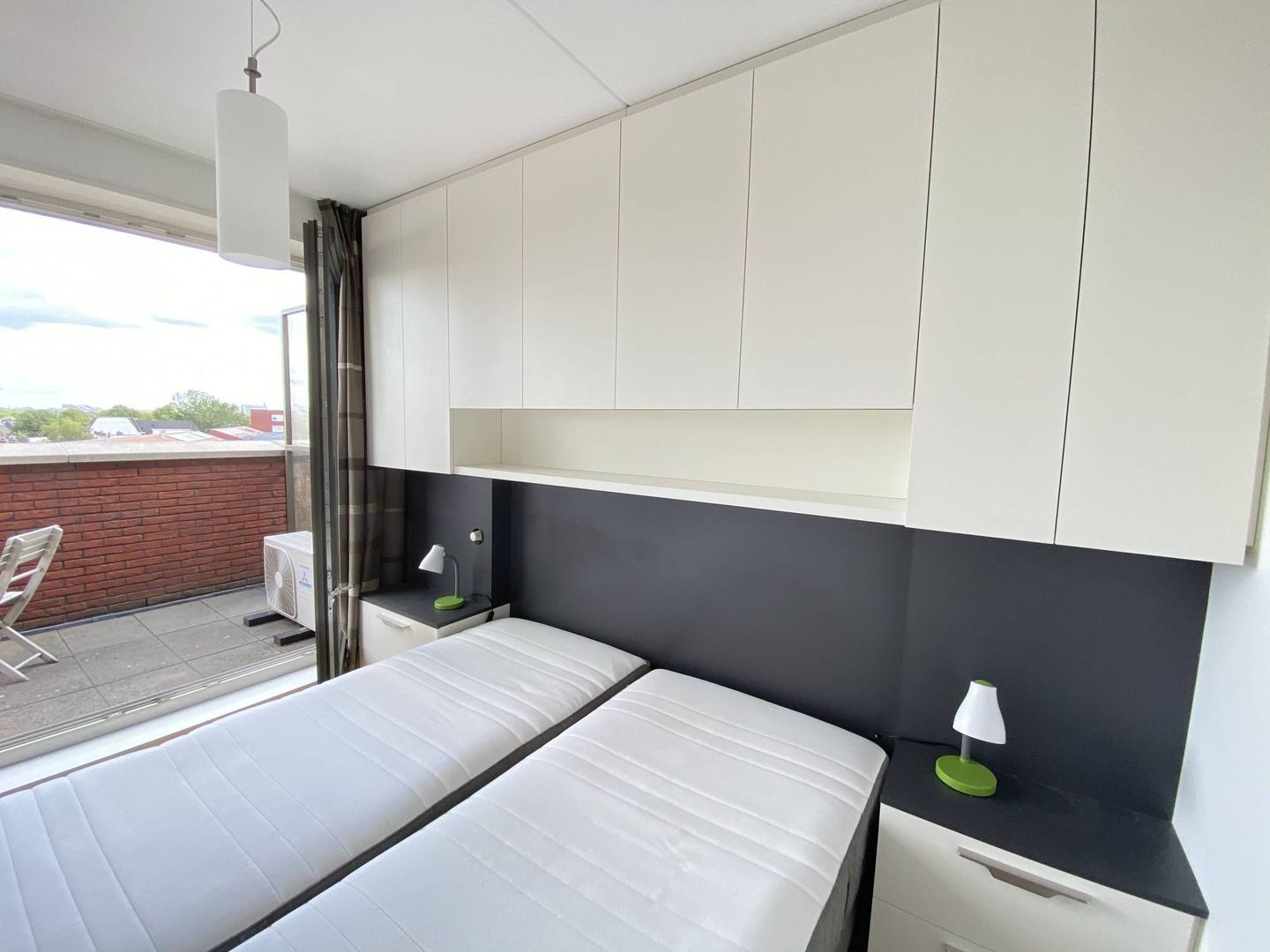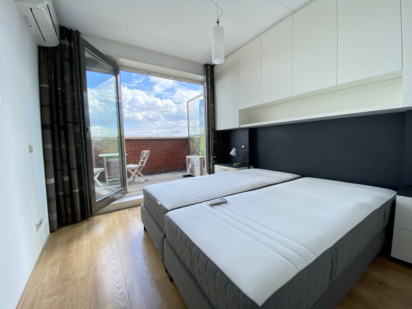 1e slaapkamer met met airconditioning en toegang tot het terras, vanuit de tweede slaapkamer is ook toegang tot het terras.
