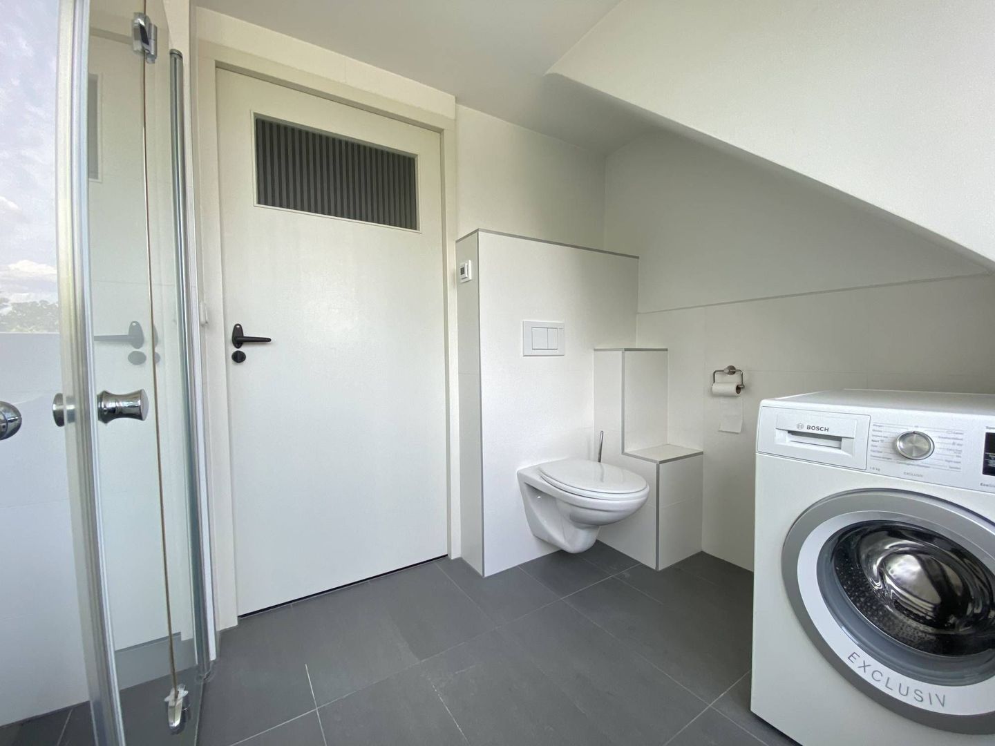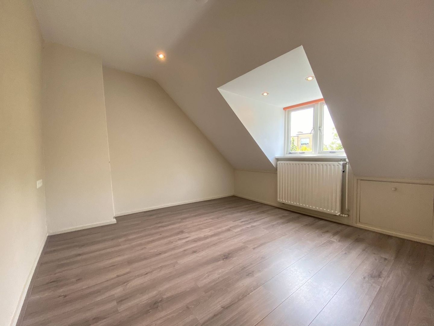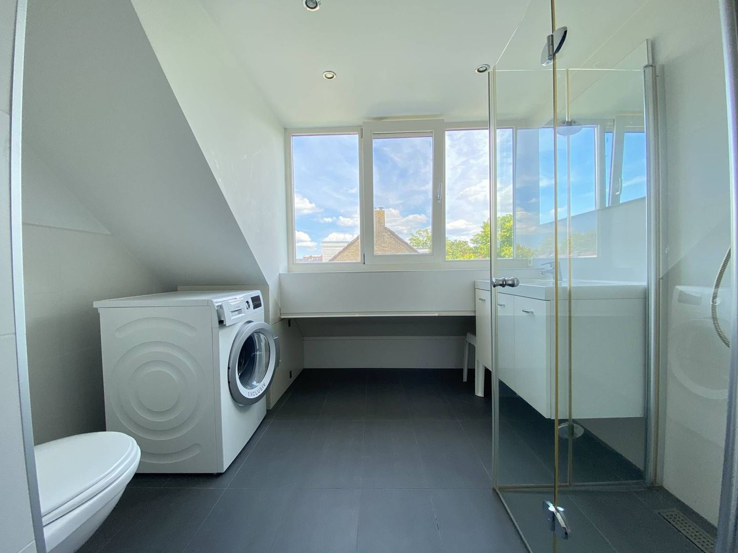2 ruime slaapkamers, luik met vlizotrap, badkamer met douche, wastafel, toilet en wasmachine, 2 diepe bergkasten