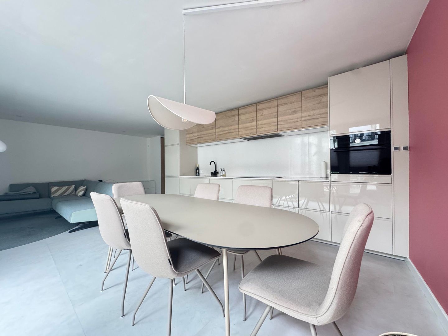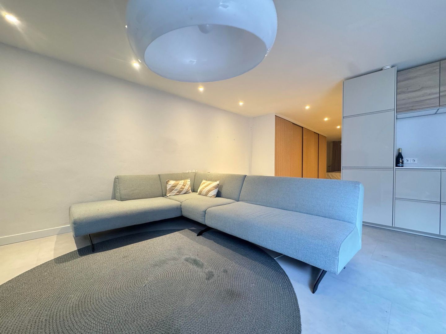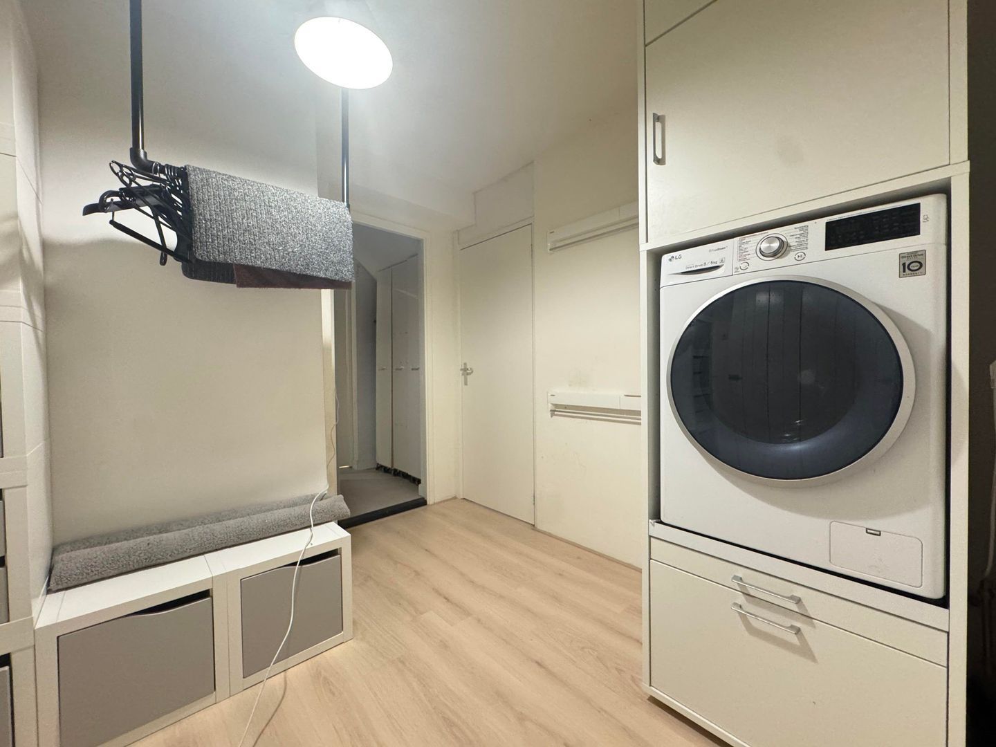 Entree, eetkamer, luxe open keuken met alle apparatuur, woonkamer / zithoek, passage met veel kastruimte en open slaapkamer, luxe badkamer met ruime douche, toilet en wastafel met meubel. Passage met kastruimte naar opslagruimte / laundry met wasmachine en droger, 2e ruime slaapkamer met kastruimte.