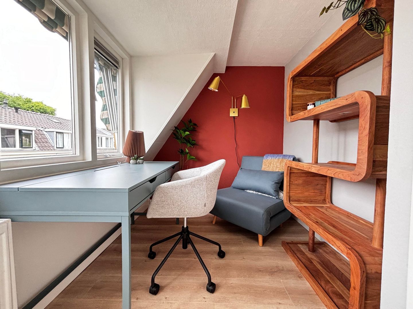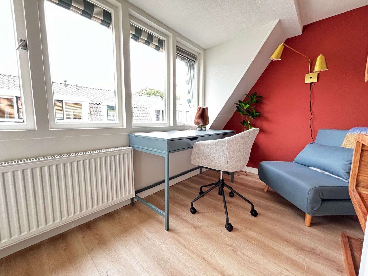 Aan de voorzijde is de fijne werkkamer gelegen. Deze is voorzien van een ingerichte werkplek en relaxstoel / logeerbed.
