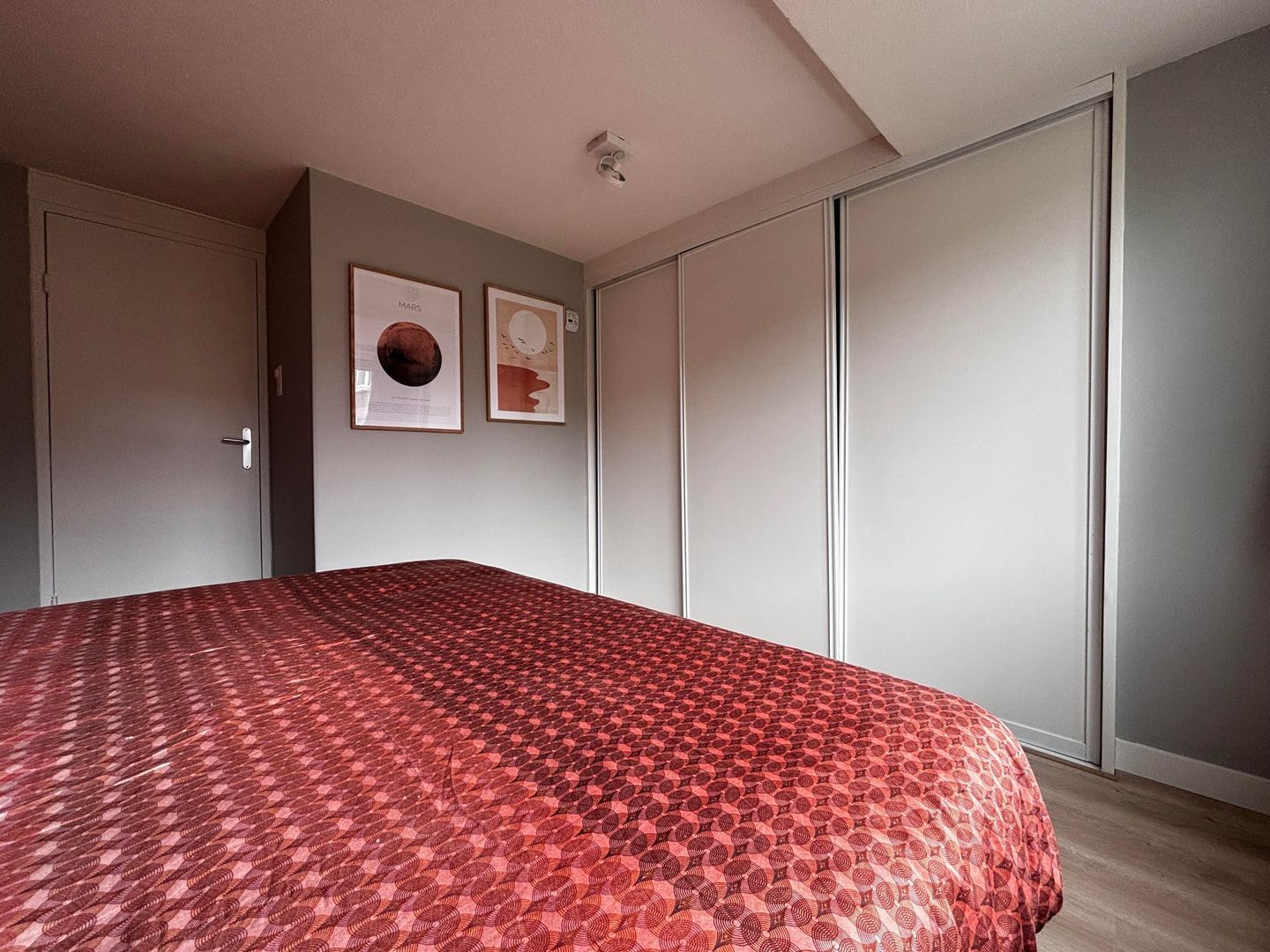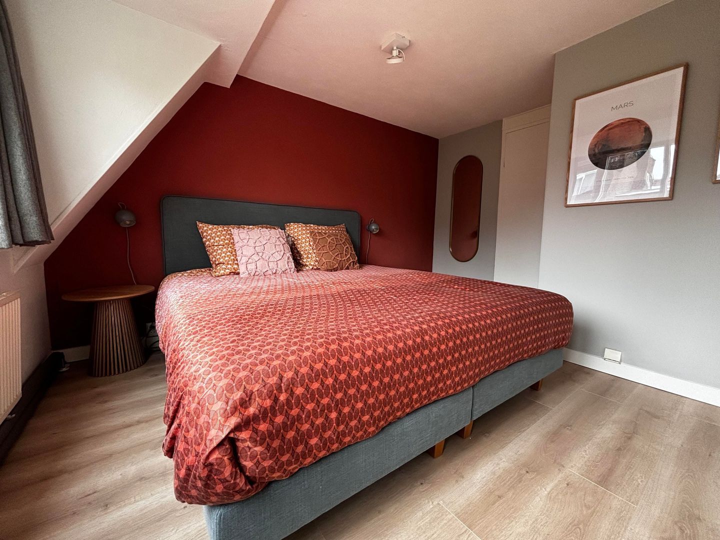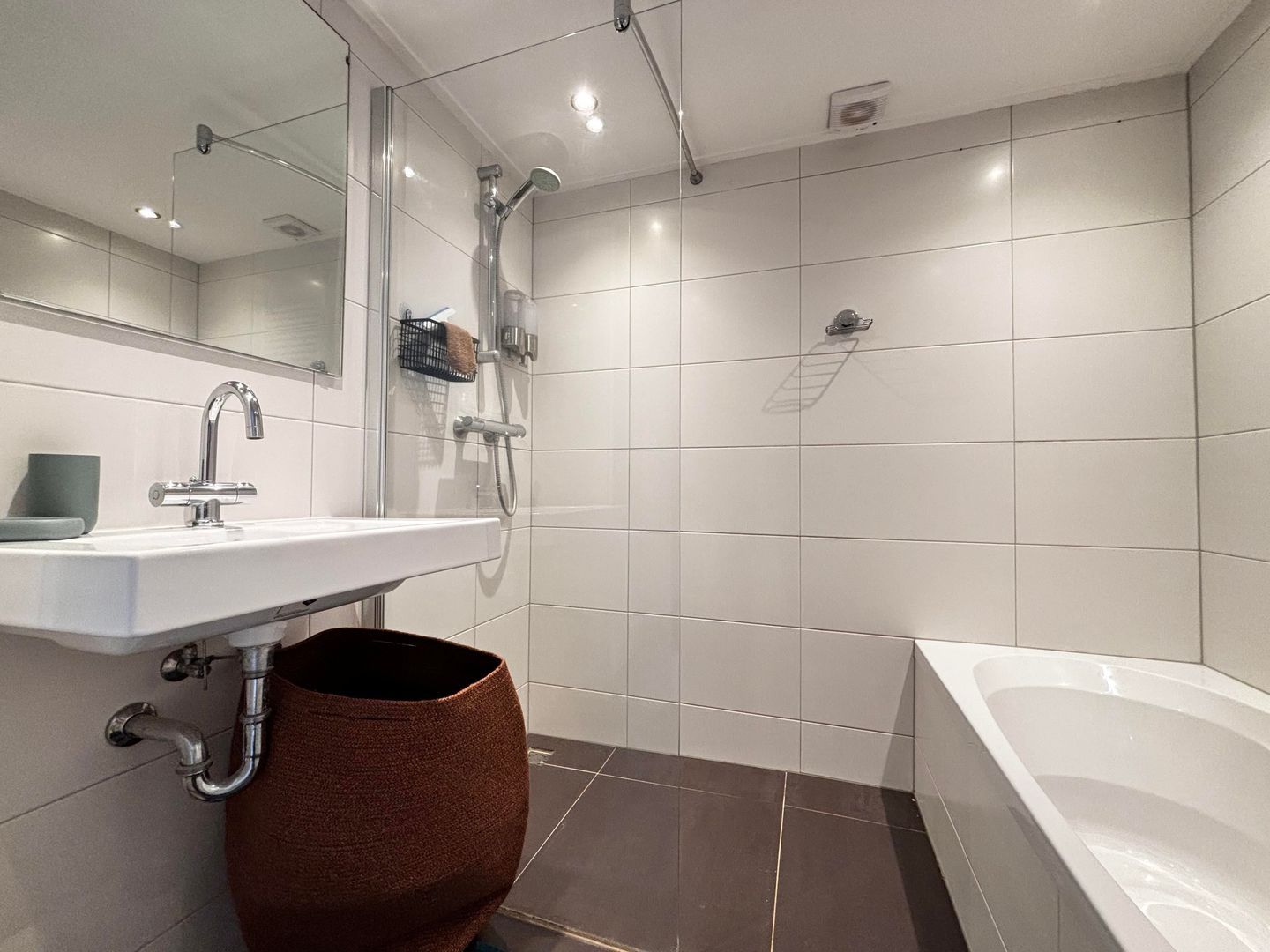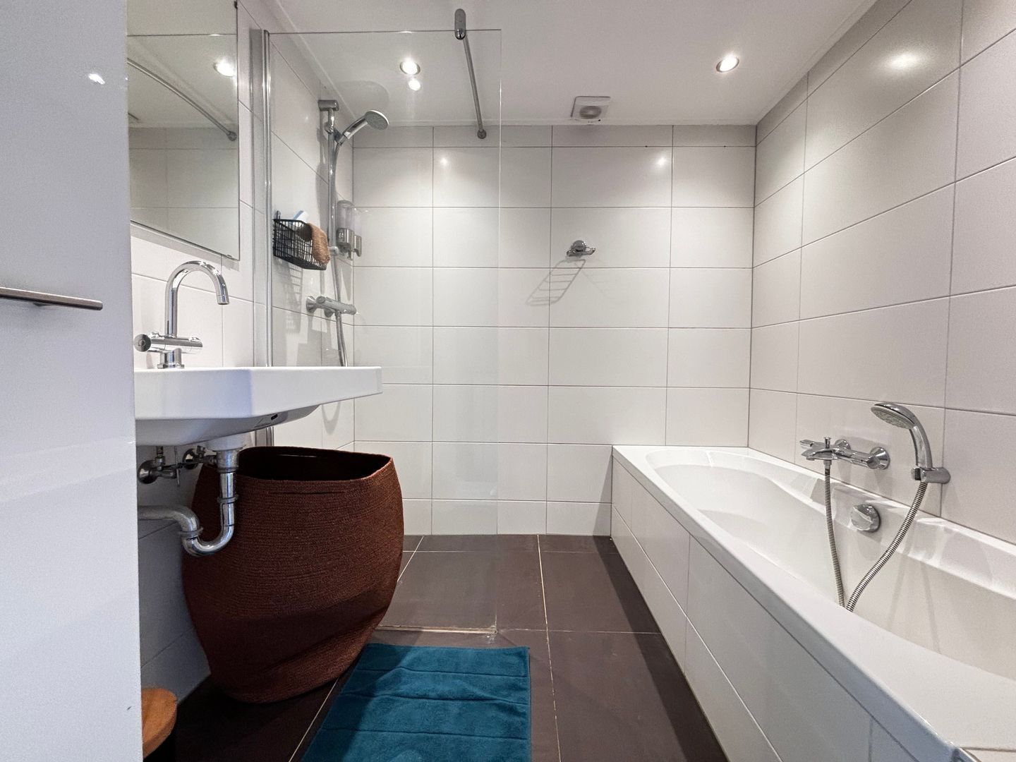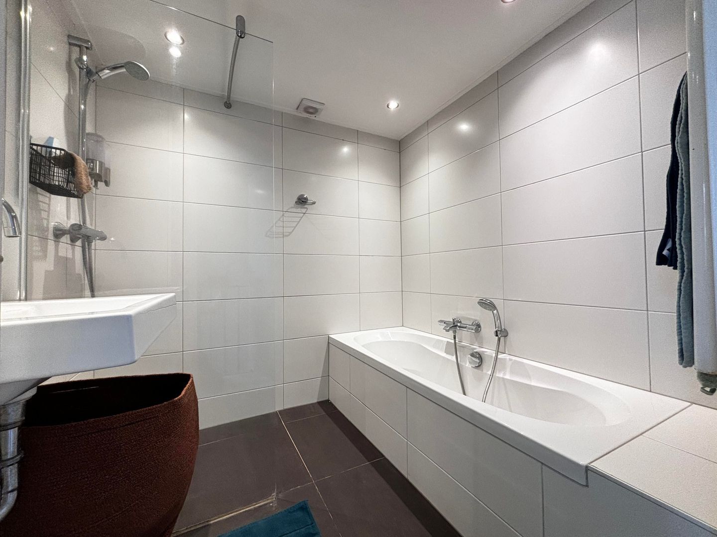 overloop, ruime slaapkamer voorzien van een dubbelbed en inbouwkasten. De moderne badkamer is voorzien van een inloopdouche, ligbad, wastafel en handdoekenradiator.
