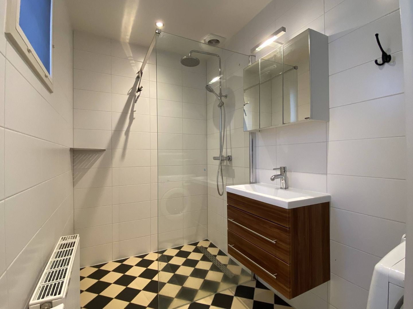 Begane grond: entree/hal, L-vormige woon- en eetkamer, keuken voorzien van inbouwapparatuur en toegang tot de patiotuin, separaat toilet met wastafel, badkamer voorzien van inloopdouche, wastafel meubel en wasmachine.