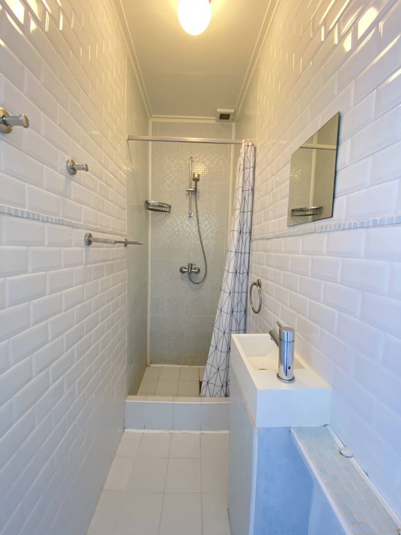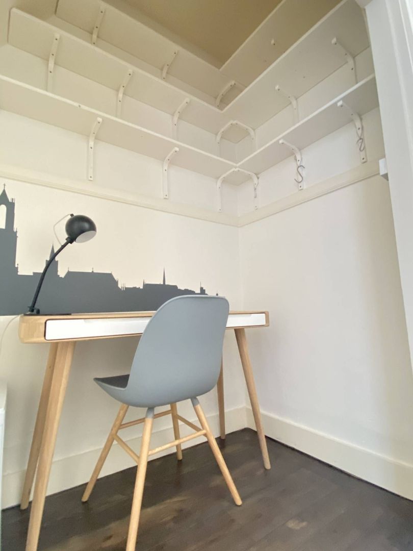 Overloop met laundry met extra bergruimte. Master bedroom en een tweede kamer ingericht als werkkamer. Badkamer met douche en wastafel.