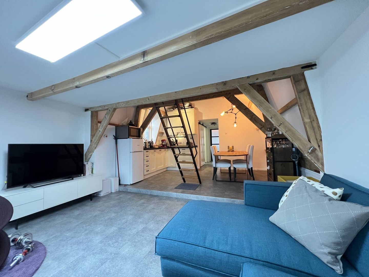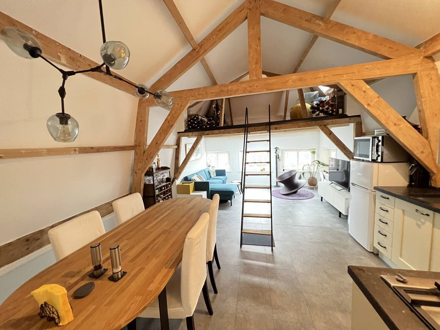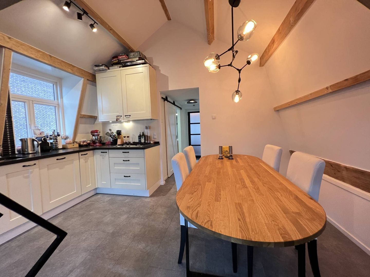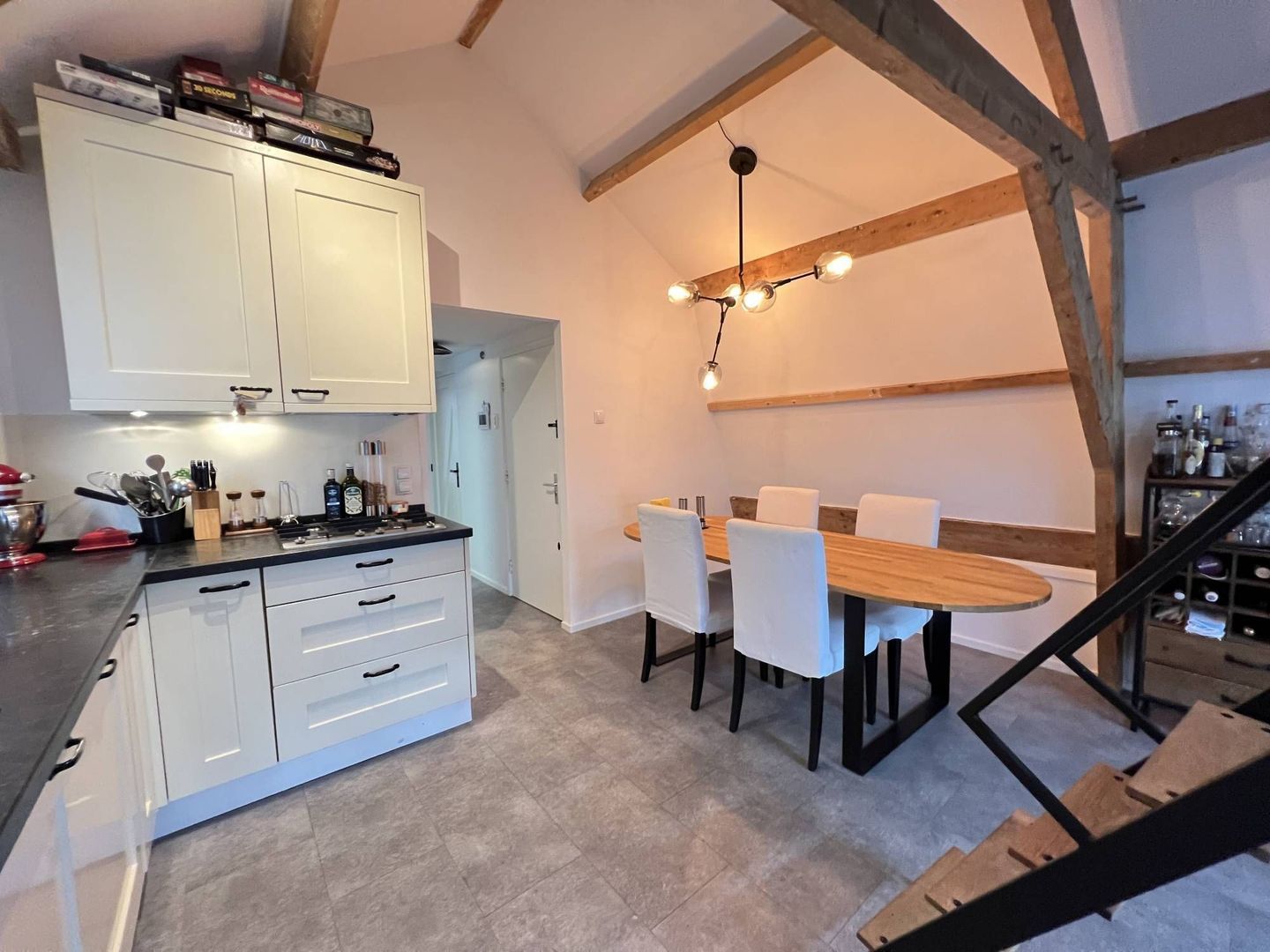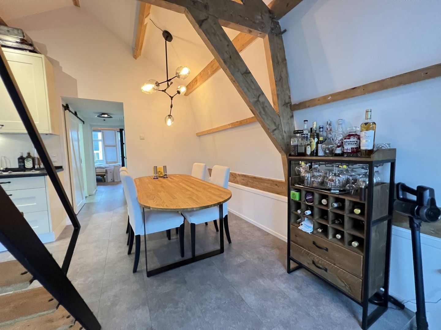 Hal, overloop, seperaat toilet, woon/eetkamer, moderne open keuken, slaapkamer, moderne badkamer en een opbergvide.