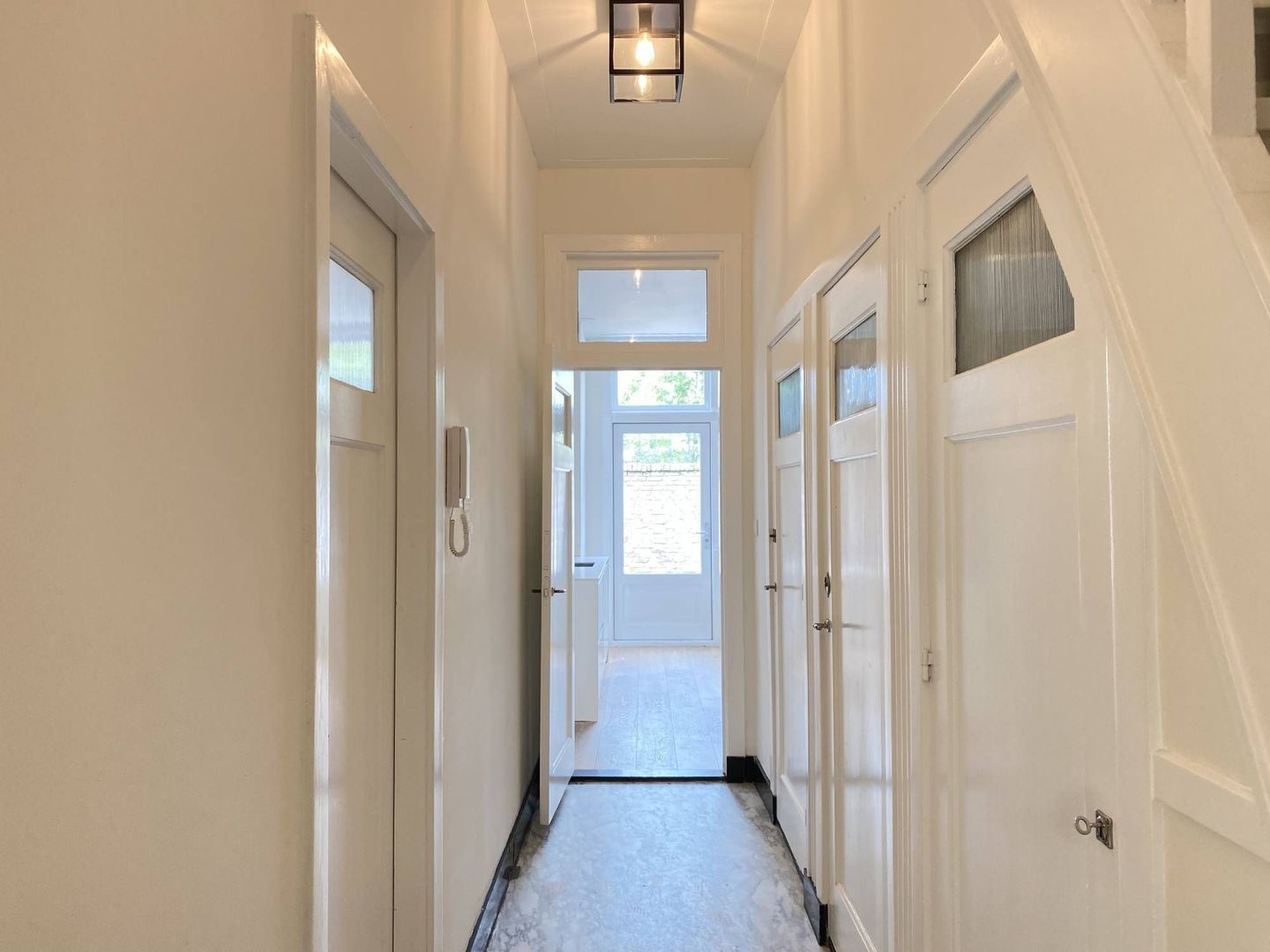 Vanuit de centrale hal heeft men toegang tot de kelder, de wc met fonteintje, de moderne keuken, de eetkamer/ woonkamer en tot de trap naar de twee verdiepingen.