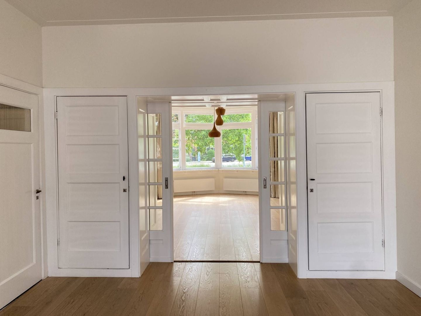 De ruimtelijke living met kamer-en-suite is voorzien van een erker aan de voorzijde aan de achterzijde bieden openslaande deuren toegang tot de betegelde stadstuin. Zowel de lichte woonkamer als de eetkamer zijn voorzien van een open haard met originele schouw. Tevens zijn zij voorzien van vaste kasten en van glas-in-lood in de raampartijen.