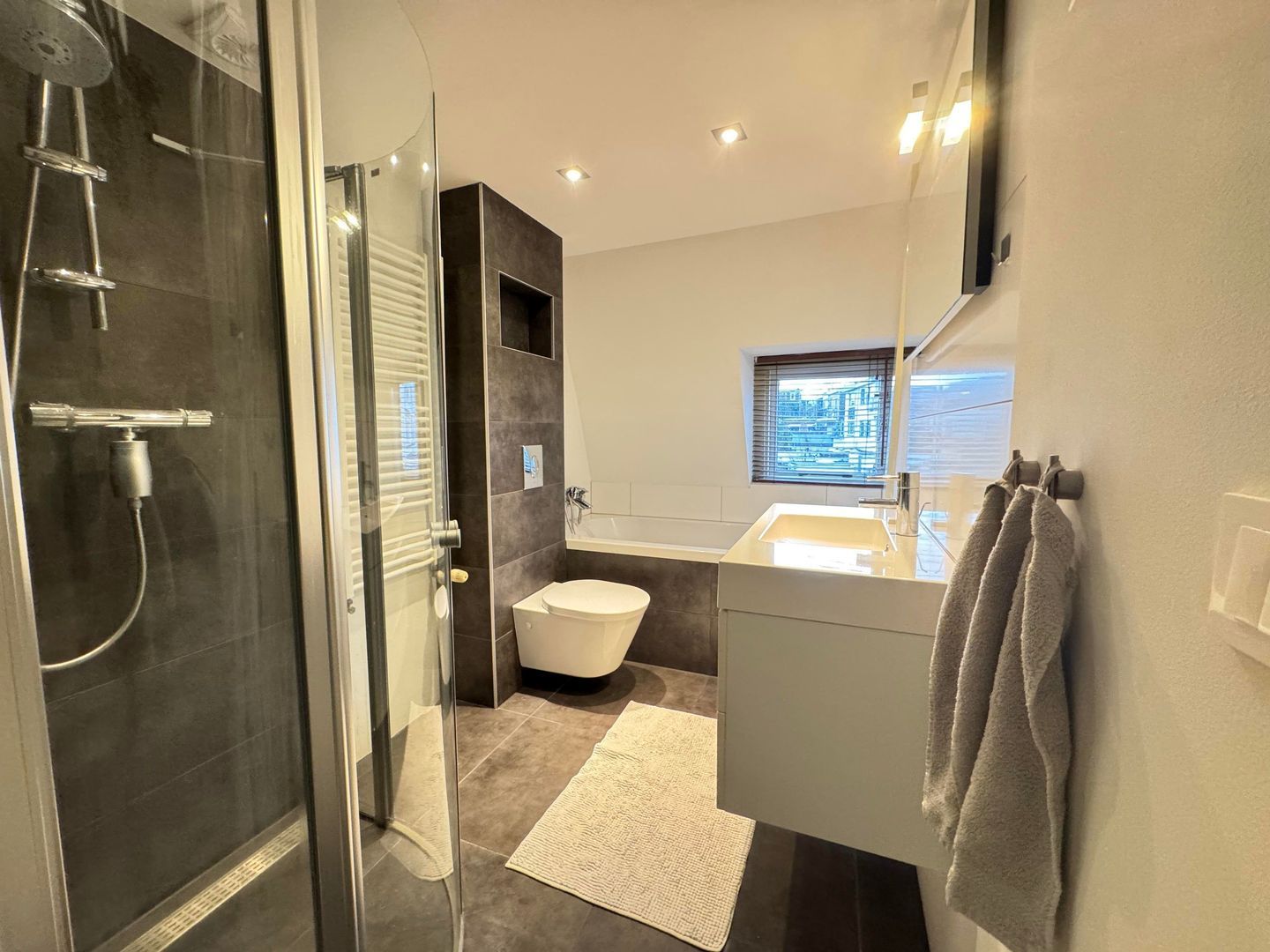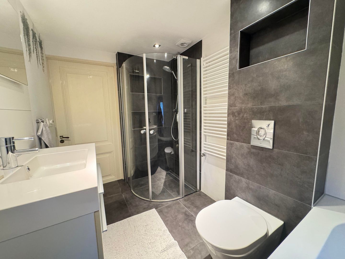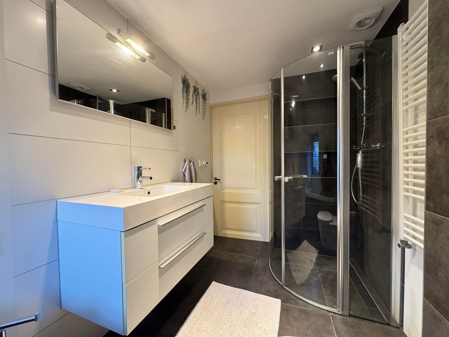 Op de eerste verdieping een grote en mooie slaapkamer met grote inbouwkast, een badkamer met bad, douche, wc en wastafel en een balkon.