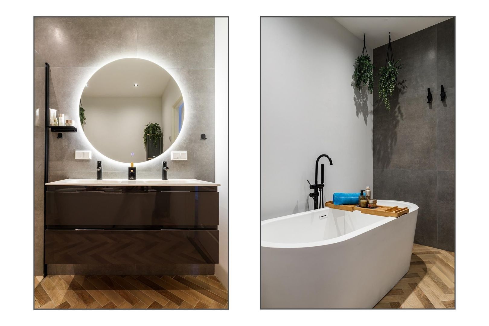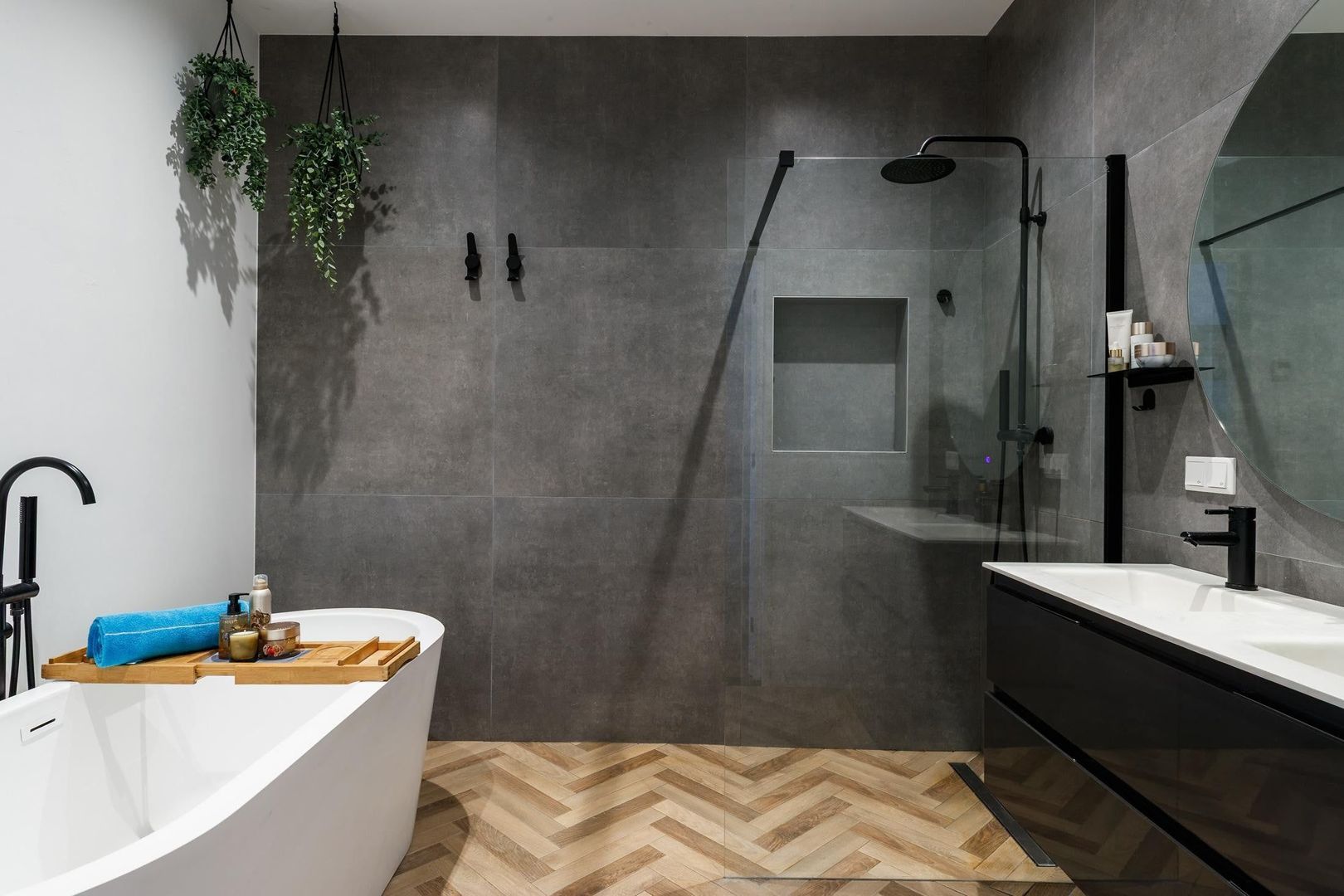 De luxe badkamer is uitgevoerd met een vrijstaand ligbad, ruime inloopdouche en een stijlvol badkamermeubel met dubbele wastafel.
