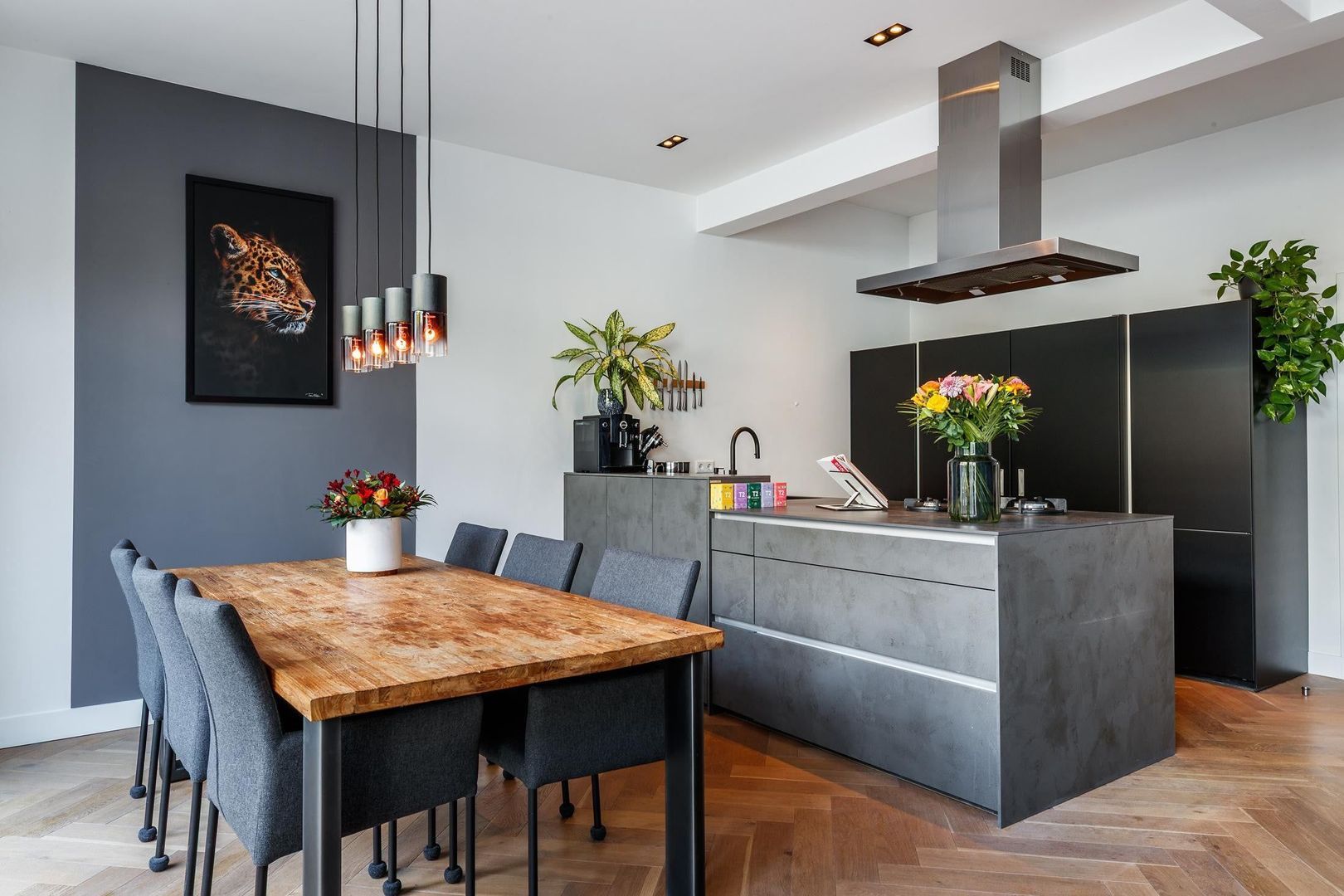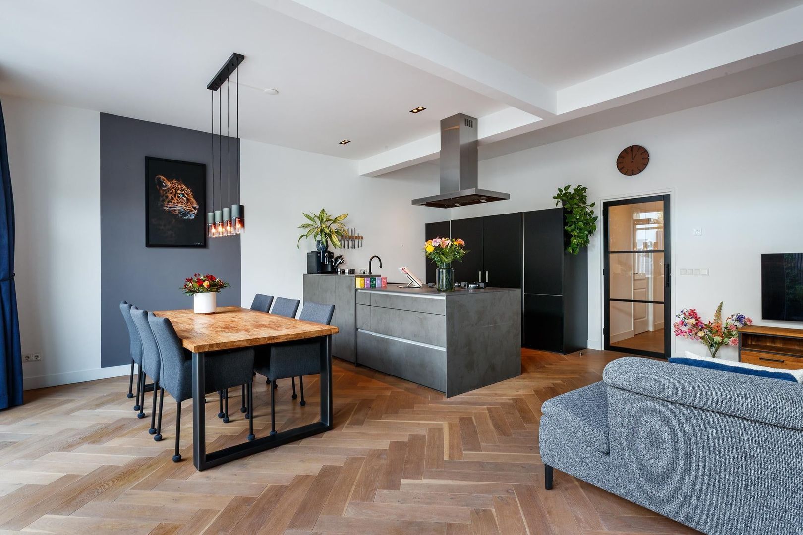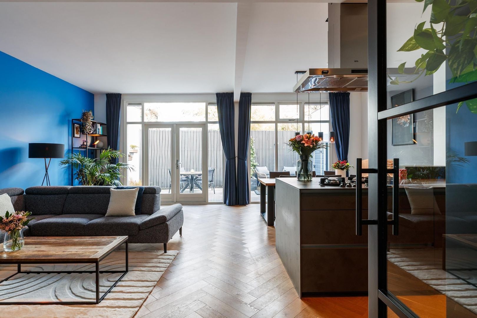 Aan de achterzijde ligt de royale, lichte woonkamer met openslaande deuren naar de tuin. De moderne open keuken van Nolte is een echte eyecatcher en voorzien van veel kastruimte, een composiet werkblad met geïntegreerde kookpitten, een RVS-afzuigkap en diverse hoogwaardige inbouwapparatuur, waaronder een vaatwasser en een oven met stoom- en grillfunctie.