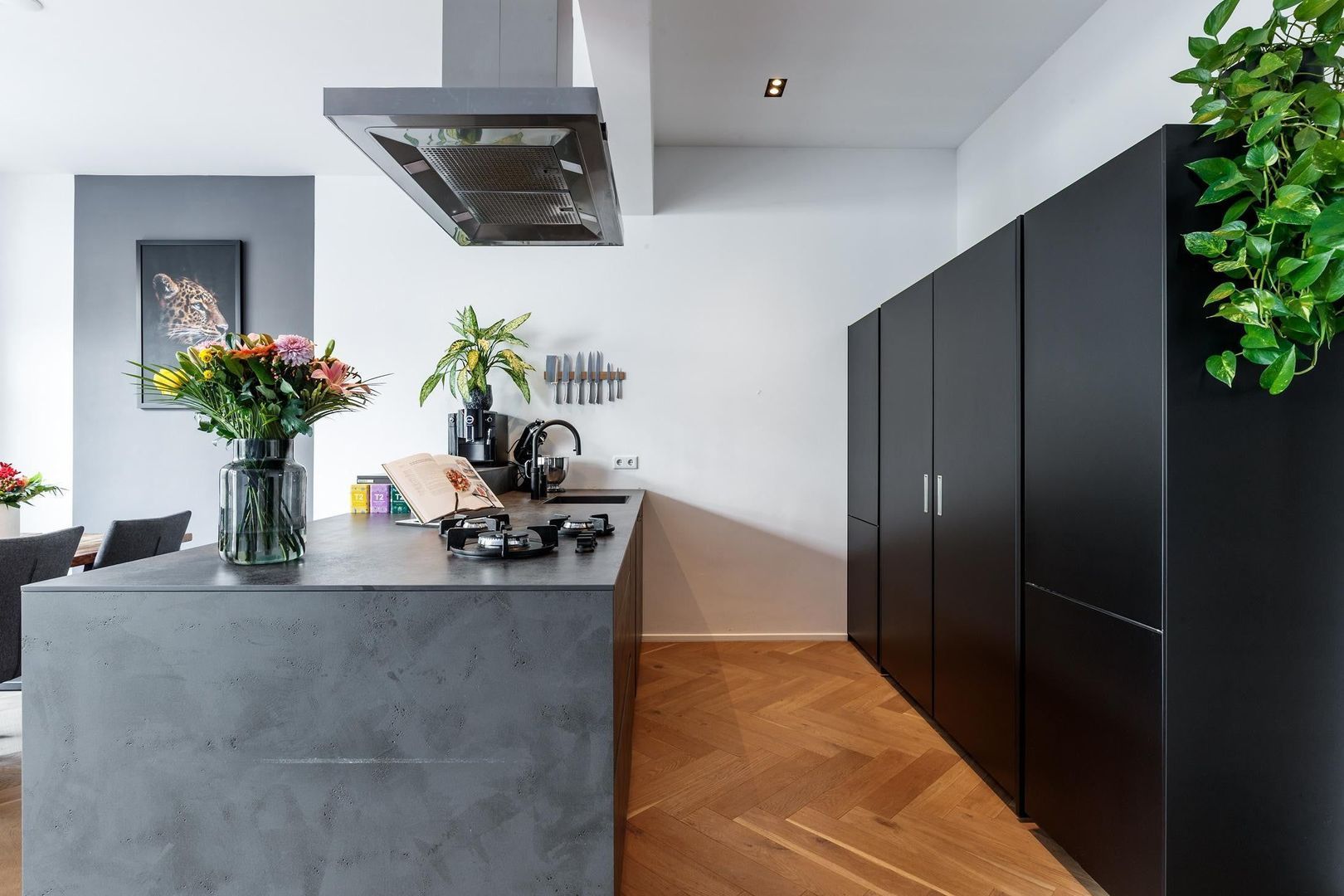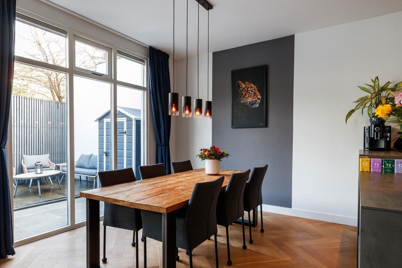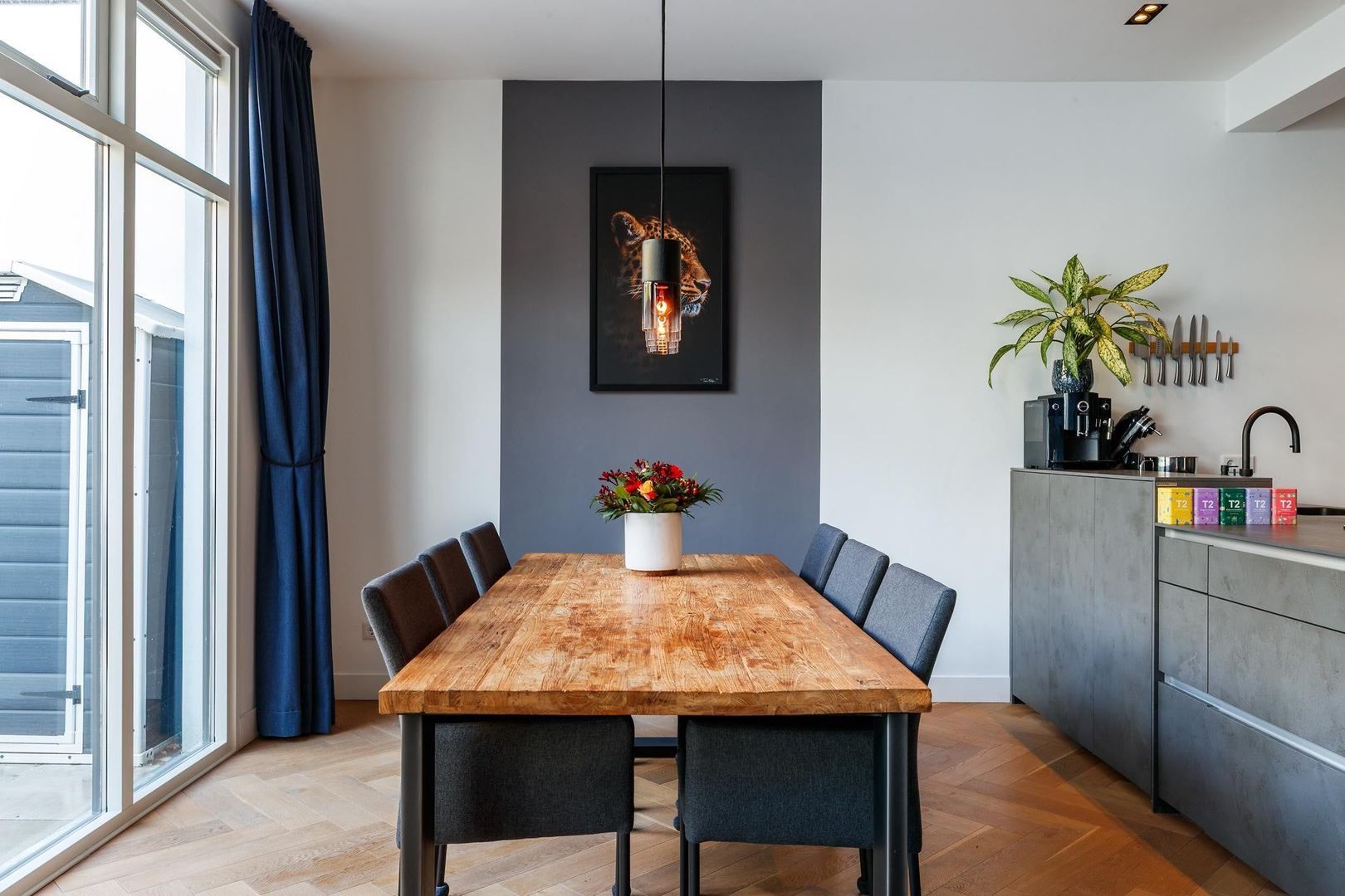 Aan de achterzijde ligt de royale, lichte woonkamer met openslaande deuren naar de tuin. De moderne open keuken van Nolte is een echte eyecatcher en voorzien van veel kastruimte, een composiet werkblad met geïntegreerde kookpitten, een RVS-afzuigkap en diverse hoogwaardige inbouwapparatuur, waaronder een vaatwasser en een oven met stoom- en grillfunctie.
