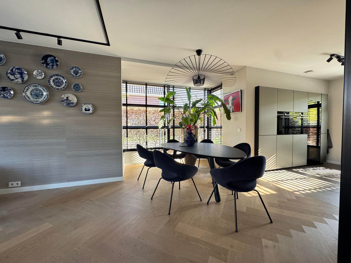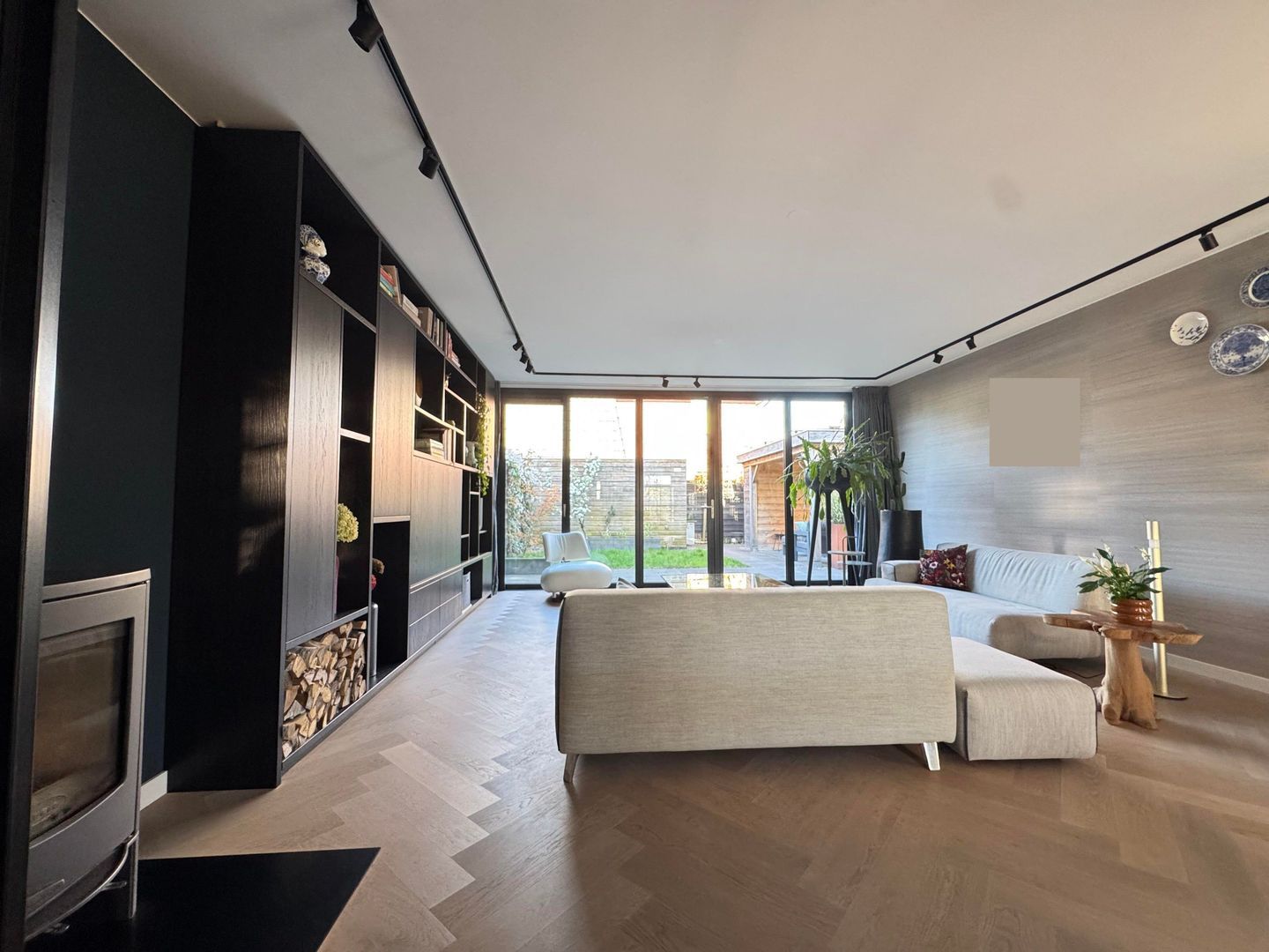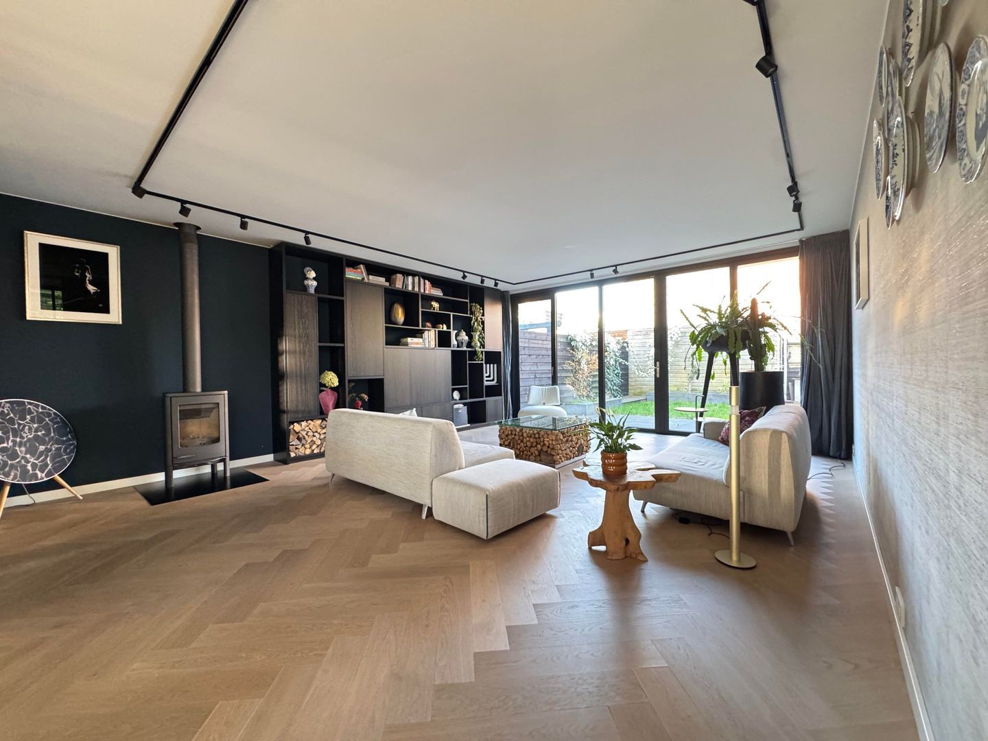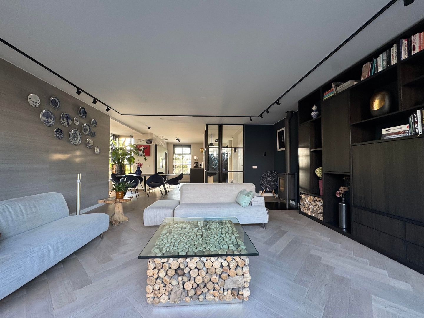Indeling; Hal met modern toilet met wasbak, trap naar de eerste etage en een glazen deur naar de woonkamer. De lichte woonkamer is sfeervol ingericht en voorzien van een prachtige lichte houten vloer met vloerverwarming, een moderne kastenwand en een vrijstaande open haard voor gezellige avonden. De open indeling van deze zeer ruime woonkamer met erker zorgt voor een ruimtelijk gevoel, terwijl de grote glazen vouwwand naar de tuin voor veel daglicht zorgt. De moderne halfopen keuken is uitgerust met alle benodigde apparatuur inclusief een wijnklimaatkast. De woning is harmonisch vormgegeven en voorzien van een professioneel lichtplan door een binnenhuisarchitect.