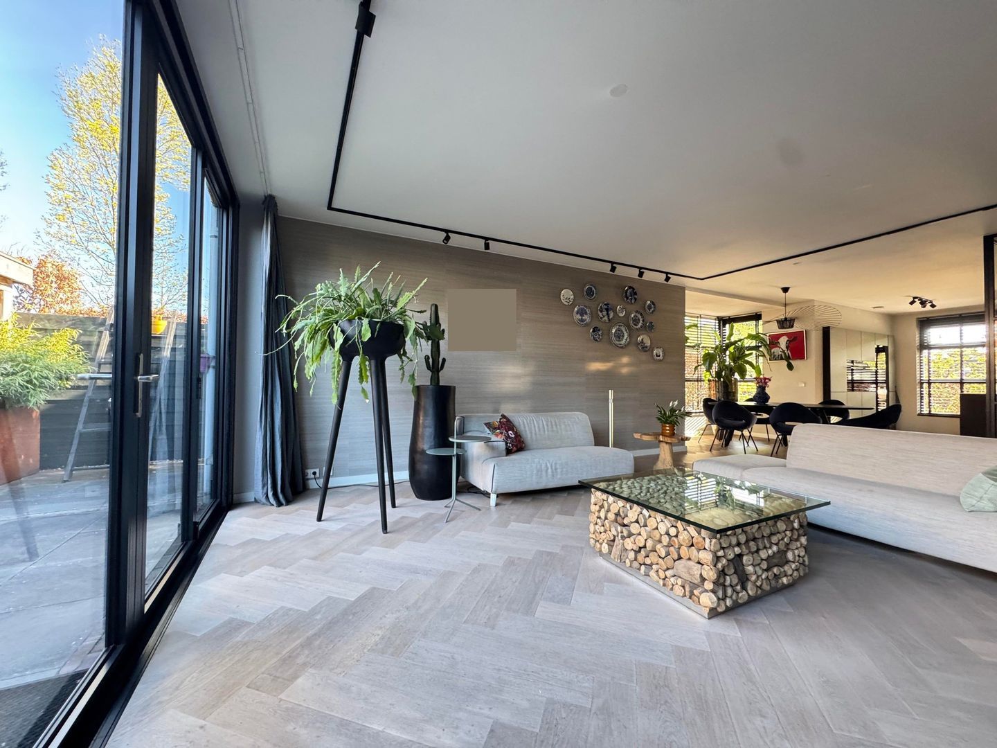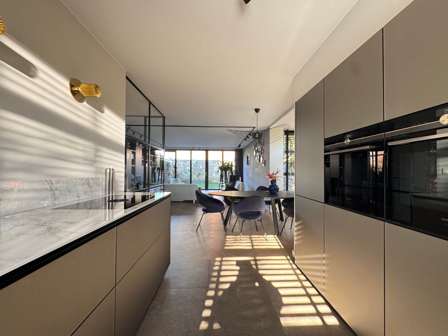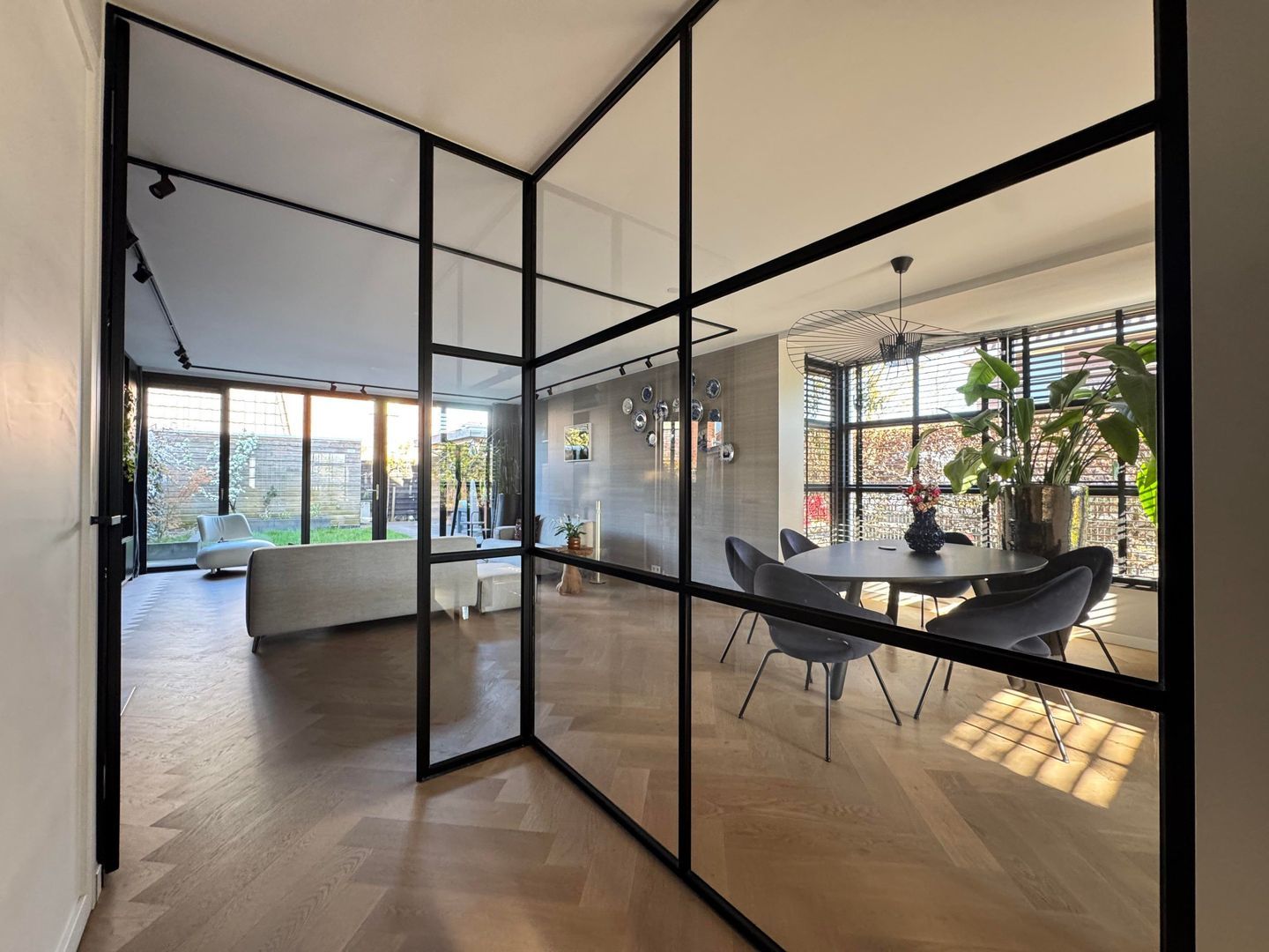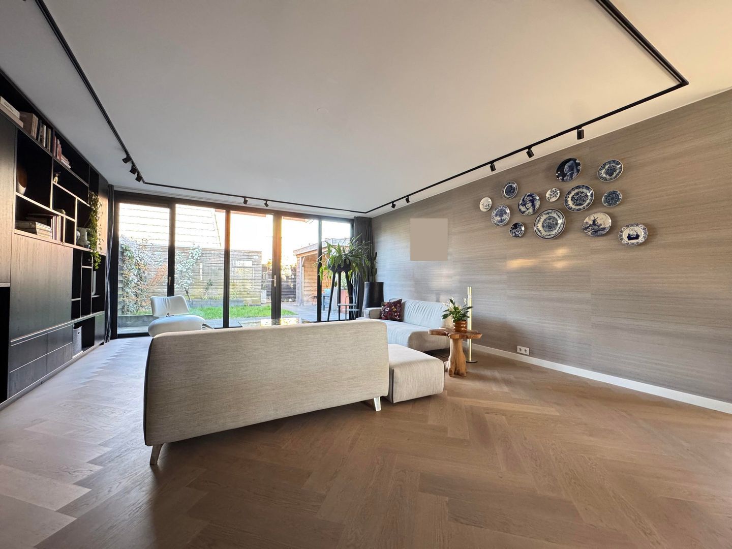 Indeling; Hal met modern toilet met wasbak, trap naar de eerste etage en een glazen deur naar de woonkamer. De lichte woonkamer is sfeervol ingericht en voorzien van een prachtige lichte houten vloer met vloerverwarming, een moderne kastenwand en een vrijstaande open haard voor gezellige avonden. De open indeling van deze zeer ruime woonkamer met erker zorgt voor een ruimtelijk gevoel, terwijl de grote glazen vouwwand naar de tuin voor veel daglicht zorgt. De moderne halfopen keuken is uitgerust met alle benodigde apparatuur inclusief een wijnklimaatkast. De woning is harmonisch vormgegeven en voorzien van een professioneel lichtplan door een binnenhuisarchitect.