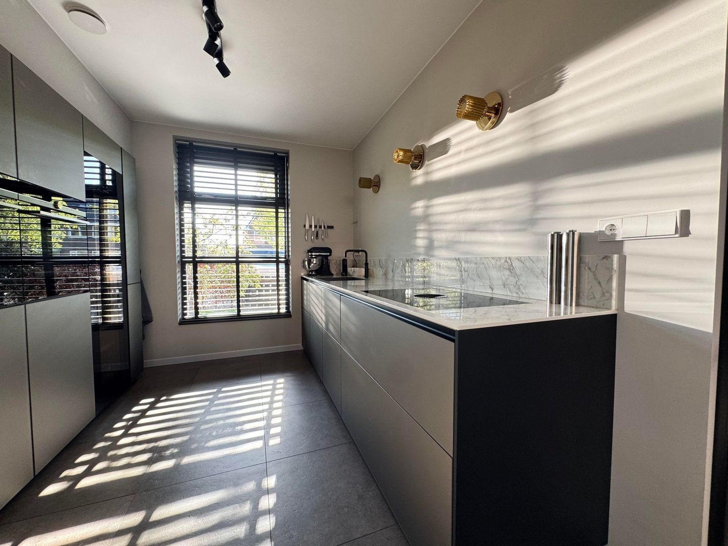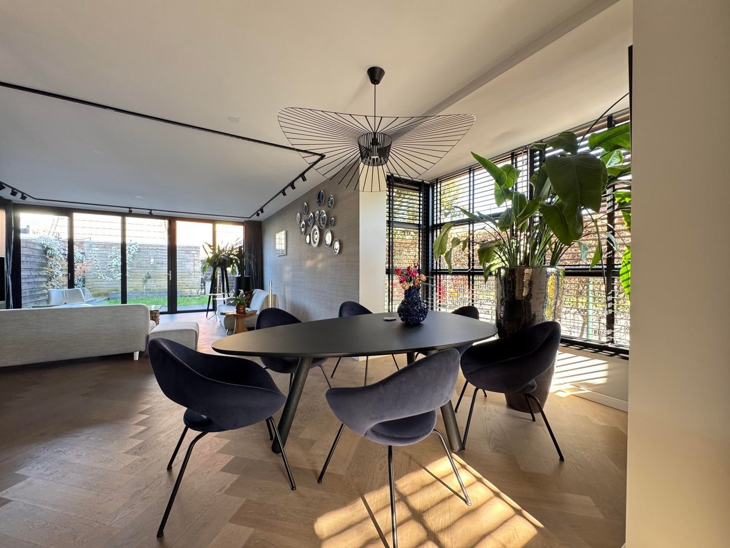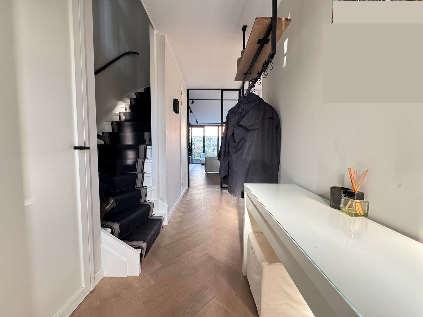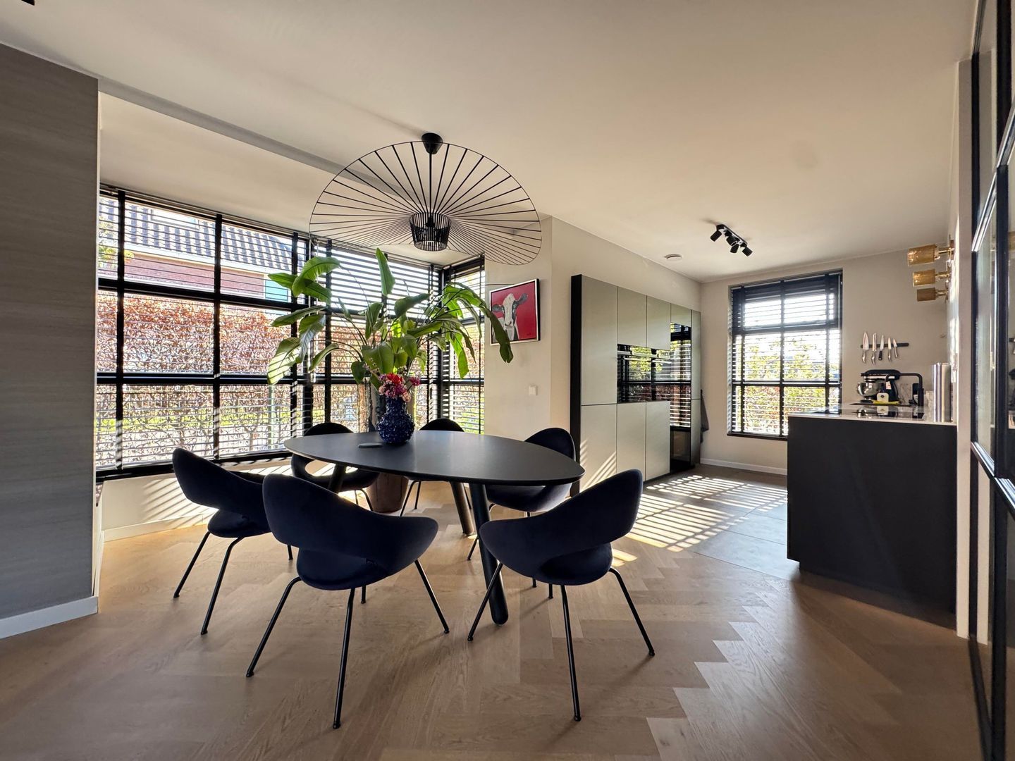 Indeling; Hal met modern toilet met wasbak, trap naar de eerste etage en een glazen deur naar de woonkamer. De lichte woonkamer is sfeervol ingericht en voorzien van een prachtige lichte houten vloer met vloerverwarming, een moderne kastenwand en een vrijstaande open haard voor gezellige avonden. De open indeling van deze zeer ruime woonkamer met erker zorgt voor een ruimtelijk gevoel, terwijl de grote glazen vouwwand naar de tuin voor veel daglicht zorgt. De moderne halfopen keuken is uitgerust met alle benodigde apparatuur inclusief een wijnklimaatkast. De woning is harmonisch vormgegeven en voorzien van een professioneel lichtplan door een binnenhuisarchitect.