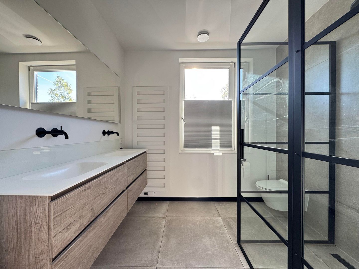 Eerste etage; Drie ruime slaapkamers, waarvan 1 als kantoor/hobbykamer te gebruiken is, en een ruime moderne badkamer met inloopdouche, toilet en dubbel wastafelmeubel.